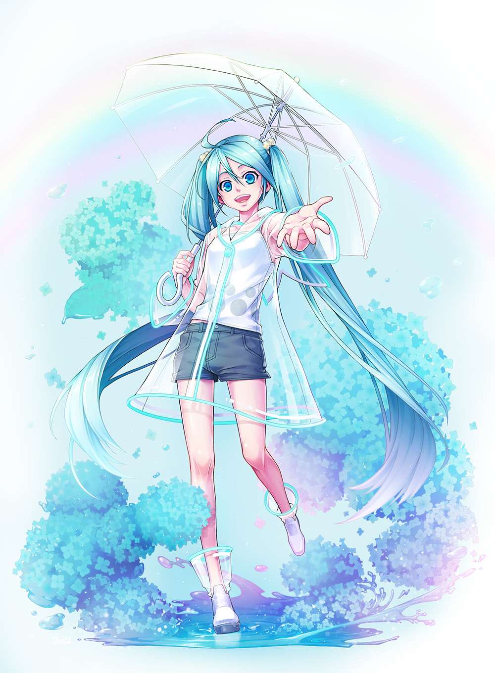 1girl ahoge alternate_costume blue_eyes blue_flower blue_hair boots camisole commentary flower hair_between_eyes hatsune_miku highres holding holding_umbrella hydrangea leg_up long_hair looking_at_viewer nishinomiya_sakuko open_mouth puddle rainbow raincoat reaching reaching_towards_viewer see-through_clothes see-through_raincoat shorts smile solo transparent transparent_umbrella twintails umbrella very_long_hair vocaloid water white_boots white_camisole