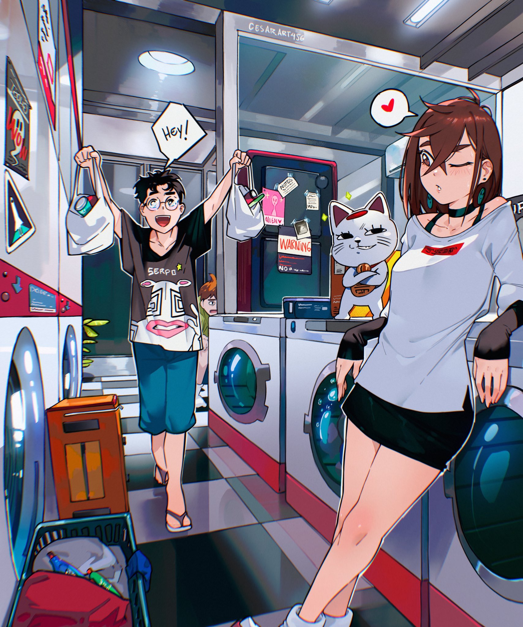 1boy 2girls arms_up ayase_momo bag black_choker black_hair black_skirt blue_shorts brown_eyes brown_hair cat cesar_art456 checkered_floor choker collarbone dandadan earrings elbow_rest feet_out_of_frame flip-flops glasses hair_between_eyes heart highres holding holding_bag indoors jewelry looking_at_another maneki-neko miniskirt multiple_girls one_eye_closed round_eyewear sandals serpo_(dandadan) shirt shopping_bag short_hair shorts skirt spanish_commentary sparkle spoken_heart standing takakura_ken_(dandadan) turbo_granny_(dandadan) walking washing_machine white_shirt