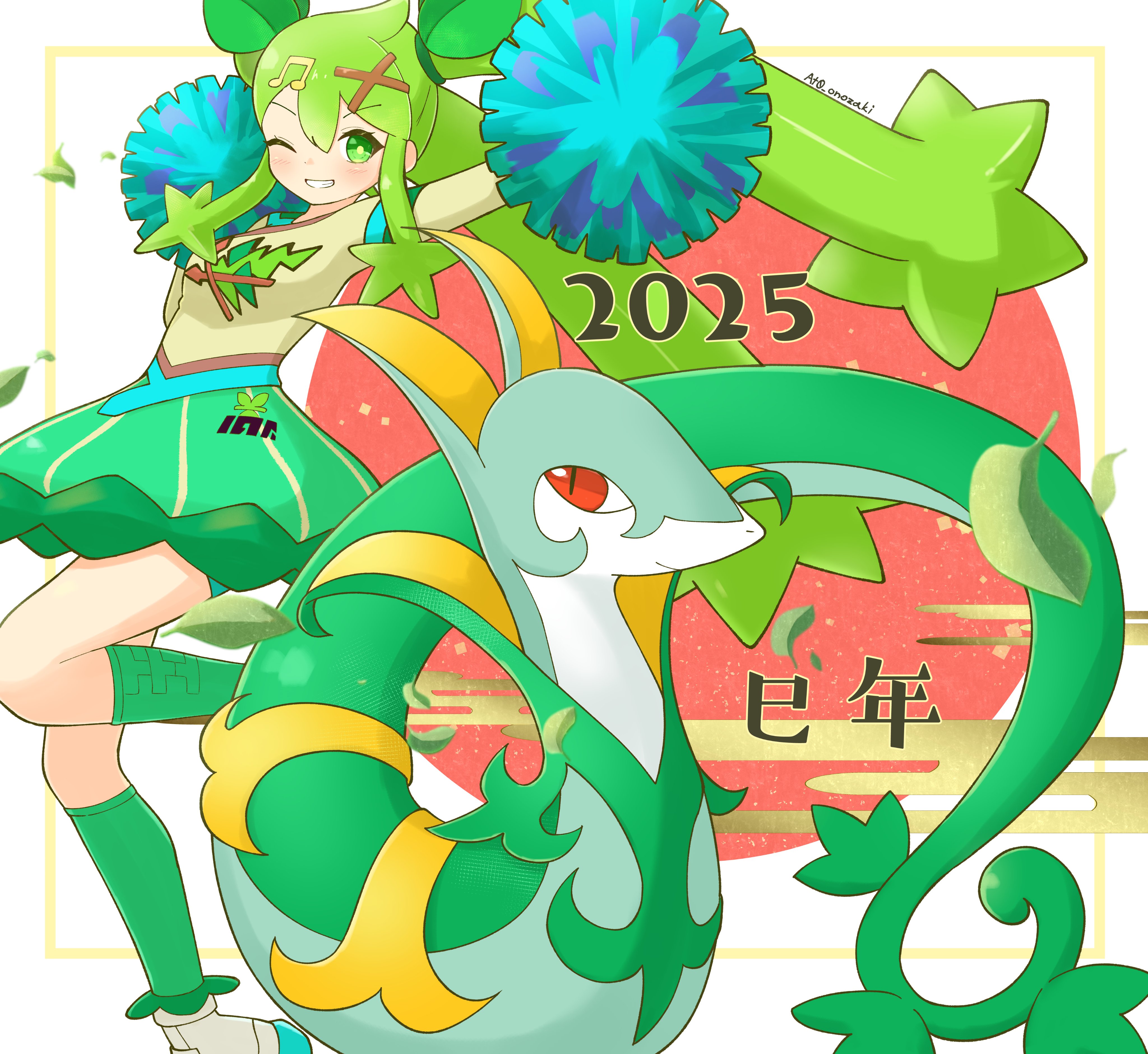 1girl 1other absurdres blush cheerleader chinese_zodiac closed_mouth fortissimo gen_5_pokemon grass_miku_(project_voltage) green_eyes green_hair green_skirt green_socks hair_between_eyes hair_ornament hatsune_miku highres long_hair looking_at_viewer musical_note musical_note_hair_ornament nintendo official_alternate_costume official_alternate_hairstyle one_eye_closed parted_lips pokemon pom_pom_(cheerleading) project_voltage red_eyes serperior shoes shonasan skirt smile snake socks teeth twintails vocaloid white_shoes x_hair_ornament year_of_the_snake