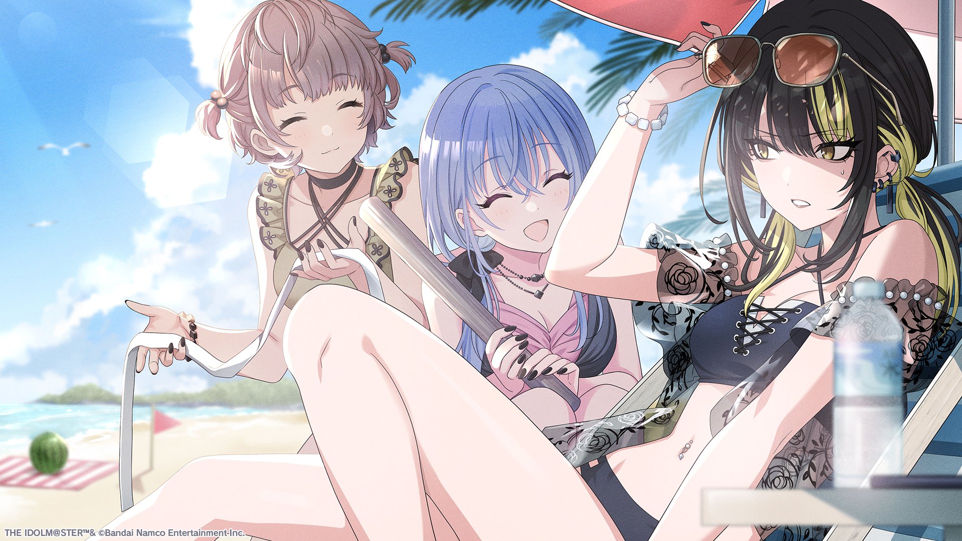 3girls beach bird black_hair black_nails blonde_hair blue_hair blue_sky blush bottle bracelet breasts brown_hair clenched_teeth closed_eyes closed_mouth cloud collarbone cometik_(idolmaster) copyright_name crossed_bangs ear_piercing eyelashes eyewear_on_head food fruit grimace highres idolmaster idolmaster_shiny_colors idolmaster_shiny_colors_song_for_prism ikaruga_luca ikuta_haruki jewelry knee_up long_hair low_twintails medium_breasts multicolored_hair multiple_girls multiple_piercings navel_piercing official_alternate_hairstyle official_art open_mouth outdoors palm_tree piercing seagull short_hair sky smile streaked_hair sunglasses sunlight suzuki_hana swimsuit teeth tree twintails two-tone_hair two_side_up water_bottle watermelon yellow_eyes
