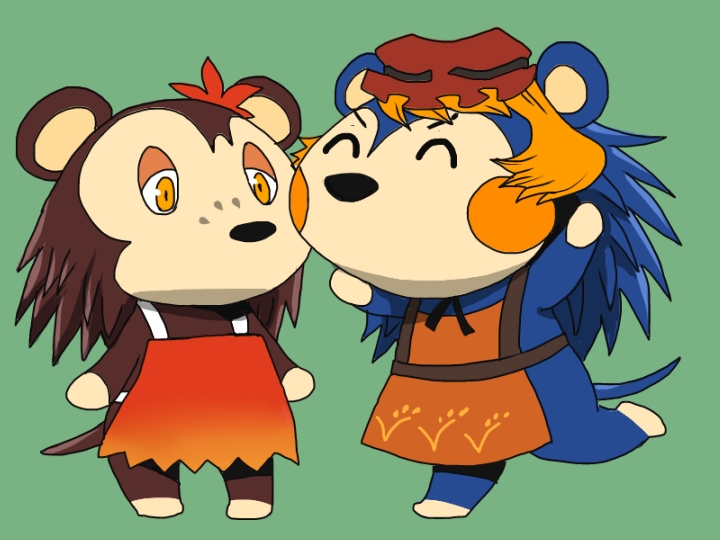 2girls aki_minoriko aki_minoriko_(cosplay) aki_shizuha aki_shizuha_(cosplay) animal_crossing apron blonde_hair blue_skin closed_eyes colored_skin commentary_request cosplay full_body green_background hair_ornament hat hedgehog_girl leaf_hair_ornament looking_at_another mabel_able_(animal_crossing) mob_cap multiple_girls nintendo no_mouth onikobe_rin orange_apron red_hat sable_able_(animal_crossing) siblings simple_background sisters touhou yellow_eyes