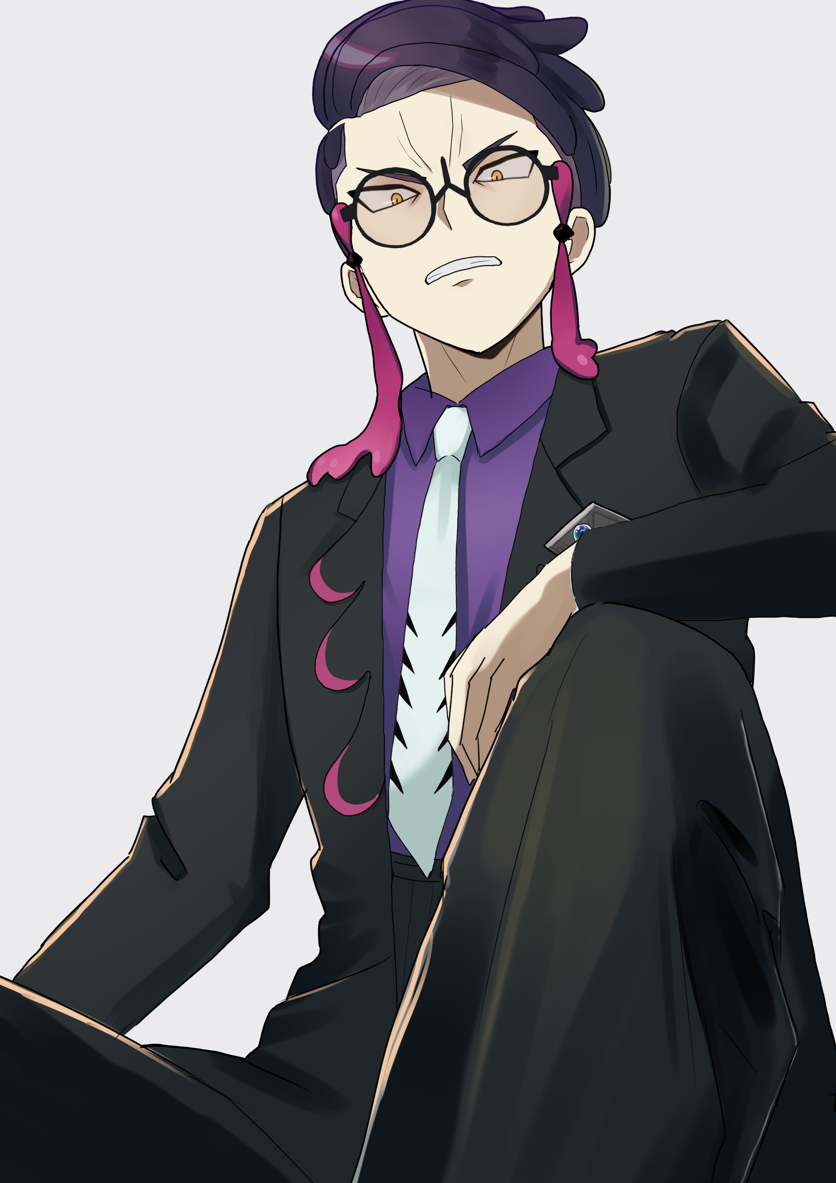 1boy absurdres angry black-framed_eyewear black_hair black_jacket black_pants clenched_teeth collared_shirt commentary_request corbeau_(pokemon) glasses highres jacket looking_at_viewer looking_down male_focus miei necktie nintendo open_clothes open_jacket pants pokemon pokemon_legends:_z-a purple_shirt round_eyewear shirt short_hair simple_background solo teeth white_background white_necktie yellow_eyes