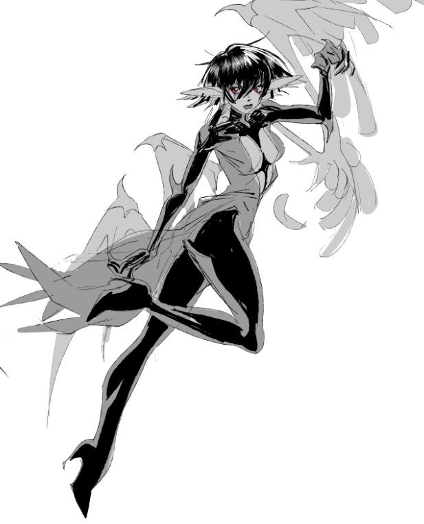 1girl arm_at_side arm_up artist_name black_dress black_hair black_lips blue_eyes bodysuit breasts cleavage closed_mouth collarbone collared_shirt dress earrings eyeshadow facial_hair female_focus flipped_hair floating full_body hair_over_one_eye heterochromia high_heels jewelry leg_up looking_at_viewer makeup medium_breasts original parted_bangs pepperacae pointy_ears red_eyes serious shirt simple_background solo spot_color turtleneck turtleneck_bodysuit v-shaped_eyebrows wings
