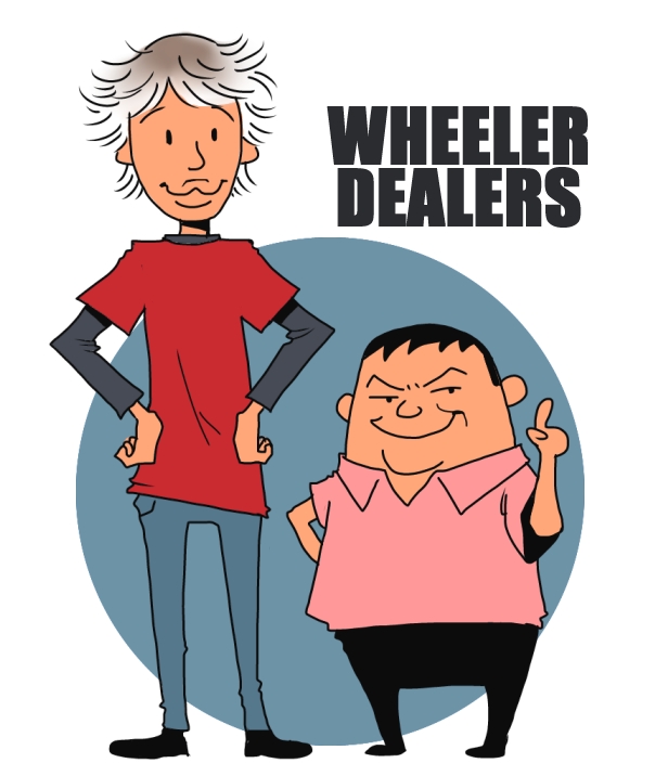 2boys black_hair black_pants black_shoes blue_background blue_pants closed_mouth collared_shirt commentary_request copyright_name edd_china full_body herge_(style) layered_sleeves long_sleeves looking_at_viewer male_focus mike_brewer multiple_boys onikobe_rin pants pink_shirt real_life red_shirt shirt shoes short_hair short_over_long_sleeves short_sleeves simple_background smile two-tone_background wheeler_dealers white_background