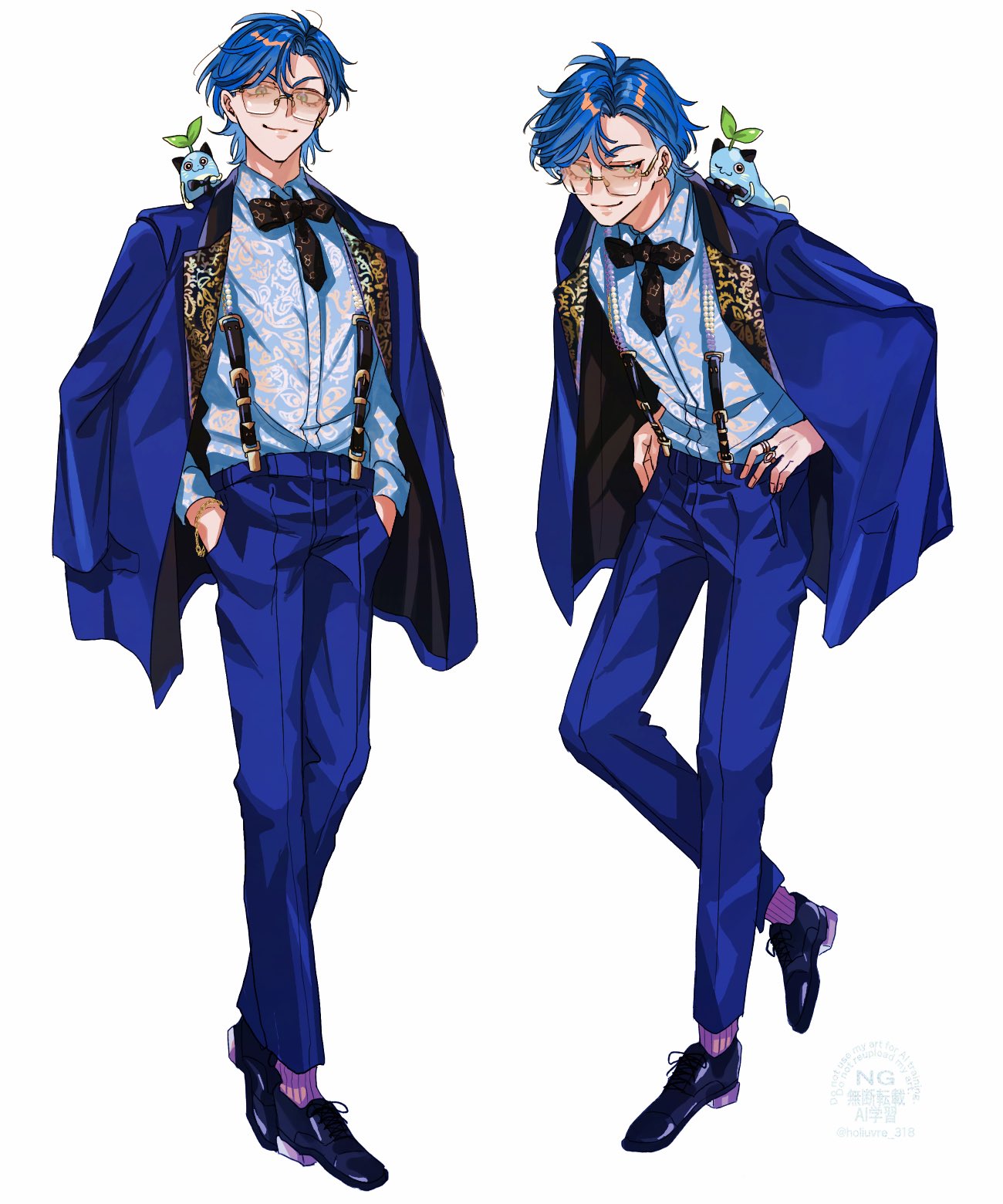 1boy animal animal_on_shoulder black_shoes blue_hair blue_pants blue_shirt bracelet collared_shirt full_body glasses hand_on_own_hip hands_in_pockets highres holiuvre_318 jewelry leos_vincent male_focus mameneko_(leos_vincent) multiple_views nijisanji one_eye_closed pants print_shirt ring shirt shirt_tucked_in shoes short_hair simple_background smile suspenders virtual_youtuber white_background
