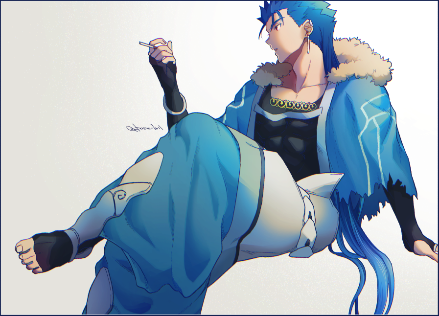 1boy adam's_apple arm_support black_shirt blue_hair cigarette collarbone cu_chulainn_(caster)_(fate) cu_chulainn_(fate) earrings fate/grand_order fate_(series) full_body jewelry long_hair looking_to_the_side male_focus open_mouth shirt simple_background smoking solo toeless_socks toned toned_male yukota_2631