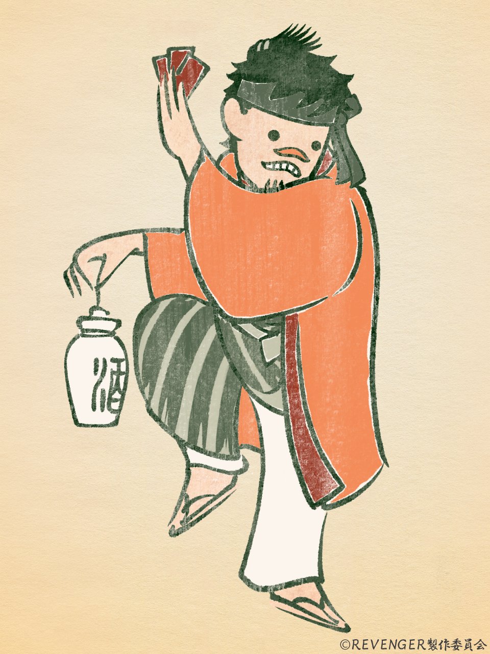 1boy black_eyes black_hair card facial_hair fine_art_parody goatee headband highres holding holding_card holding_lantern japanese_clothes lantern male_focus nihonga official_art parody revenger sandals scar scar_on_face scar_on_nose second-party_source short_hair simple_background solid_circle_eyes solo souji_(revenger) standing standing_on_one_leg ukiyo-e wide_sleeves