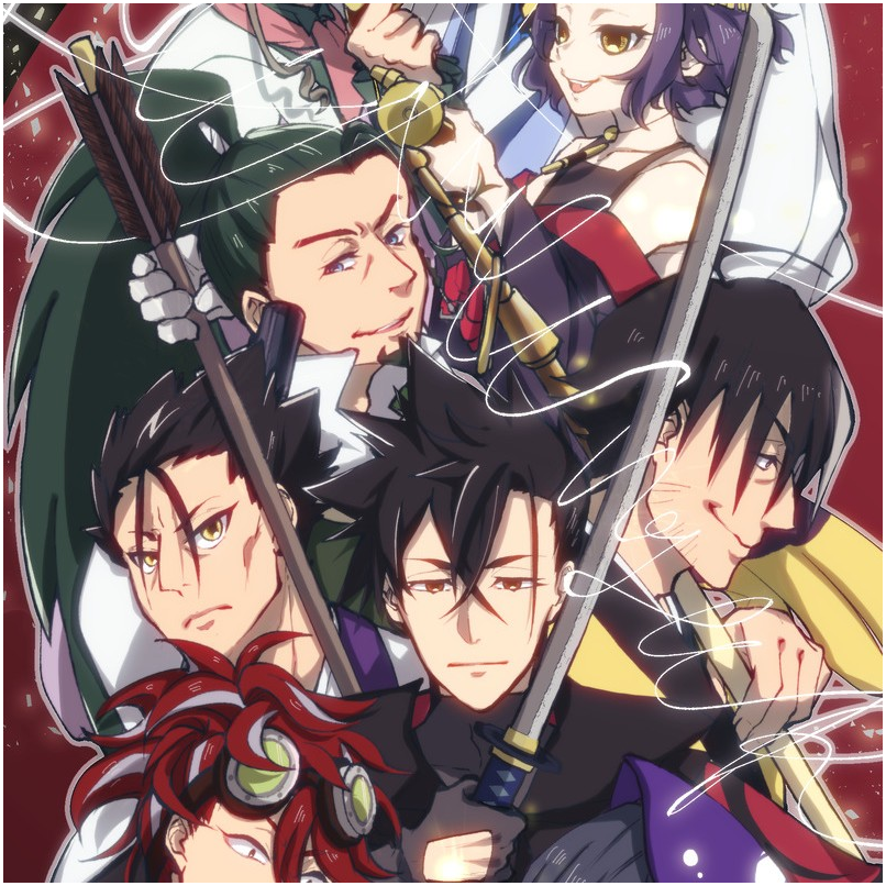 6+boys black_hair character_request cheekbones crossed_bangs fang goggles goggles_on_head green_hair hair_between_eyes holding holding_sword holding_weapon japanese_clothes kurima_raizou long_hair male_focus multiple_boys murakami_teppa nio_(revenger) ponytail purple_hair red_background revenger souji_(revenger) sparse_stubble sword tasukaritai_inc usui_yuen weapon