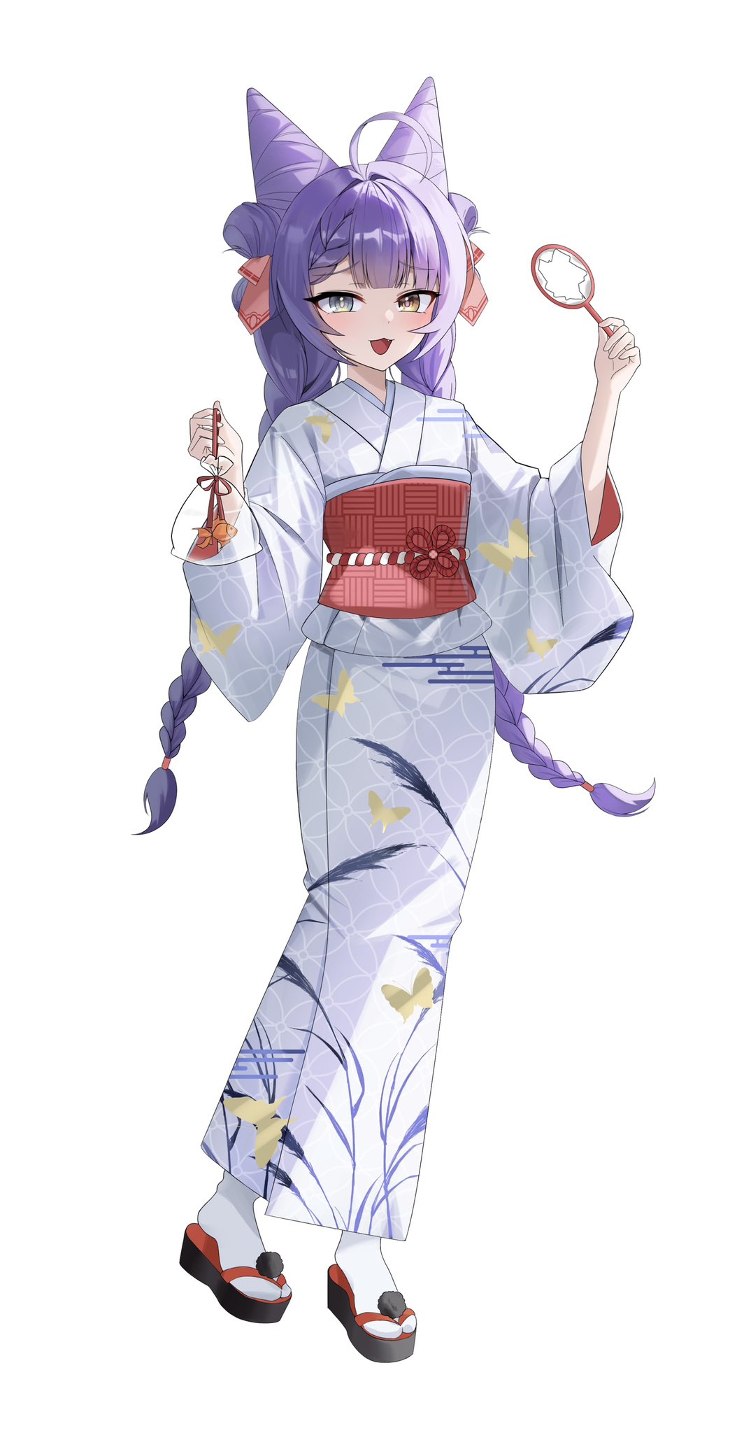 1girl ahoge blue_eyes braid cone_hair_bun full_body hair_bun heterochromia highres holding japanese_clothes kimono long_hair long_sleeves looking_at_viewer obi open_mouth purple_hair sandals sash smile solo stellive tabi tenko_shibuki twin_braids twintails very_long_hair virtual_youtuber white_kimono wide_sleeves yellow_eyes zhxms123 zouri