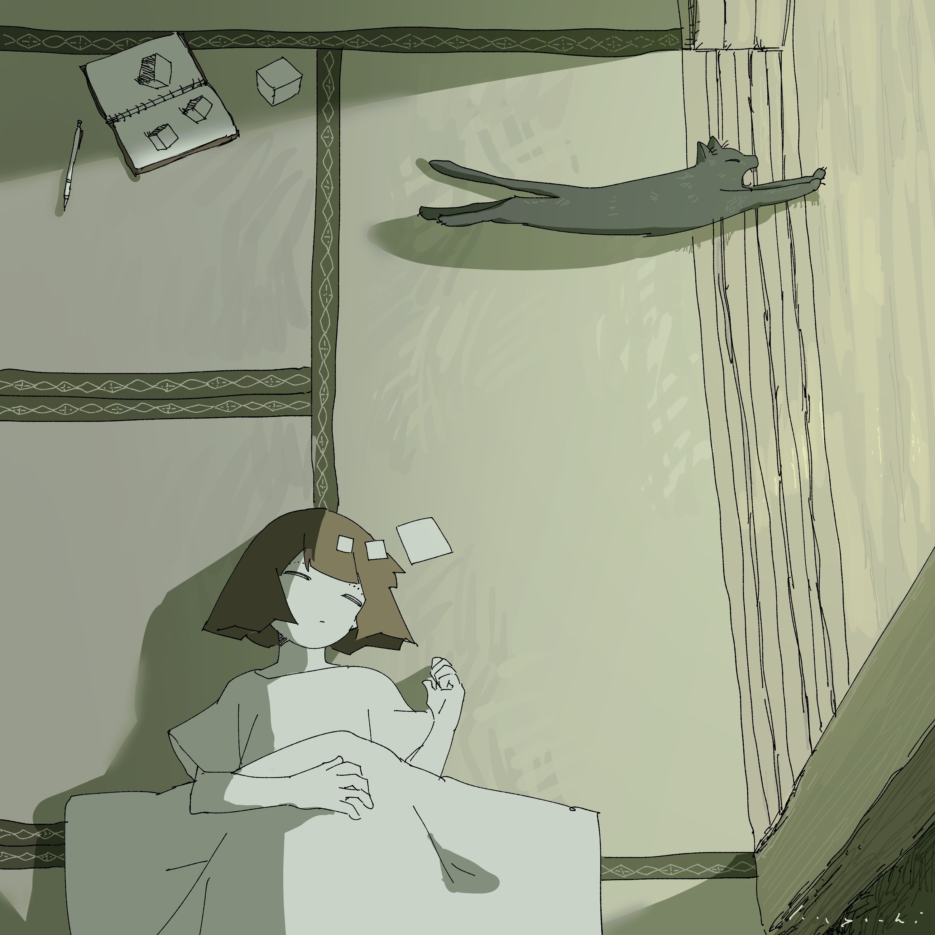 1girl absurdres animal black_cat blanket brown_hair cat closed_eyes drawing_(object) floor from_above highres indoors lying mechanical_pencil nagae_haruyoshi original pencil shirt signature sketchbook sleeping t-shirt tatami white_shirt