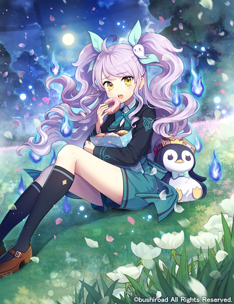 1girl anselma_(cardfight!!_vanguard) black_jacket black_socks blue_ribbon bow bowtie brown_shoes cardfight!!_vanguard commentary_request copyright_notice donut feet_out_of_frame flower food grass green_bow green_bowtie green_shorts hair_ribbon holding holding_donut holding_food jacket kneehighs long_hair long_sleeves looking_at_viewer mary_janes official_art open_mouth outdoors purple_hair ribbon ronce shoes shorts sitting socks solo tulip twintails white_flower white_tulip yellow_eyes