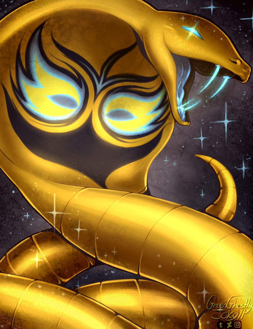 alternate_color animal_focus arbok artist_name black_background blue_eyes blue_tongue bright_pupils cobra_(animal) colored_skin colored_tongue fangs gen_1_pokemon glowing glowing_eyes gold_skin greenghostlyjekyll highres nintendo no_humans open_mouth pokemon pokemon_(creature) pokemon_focus shiny_pokemon signature snake sparkle tongue