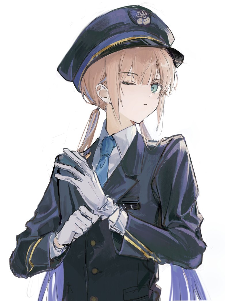 1boy adjusting_clothes adjusting_gloves androgynous black_hat black_jacket black_sleeves black_suit blonde_hair blue_hair blue_necktie captain_nemo_(fate) captain_nemo_(grand_journey)_(fate) closed_mouth collared_shirt fate/grand_order fate_(series) formal_clothes gloves gradient_hair green_eyes hat jacket long_hair long_sleeves looking_at_viewer male_focus multicolored_hair necktie nemo_(fate) one_eye_closed peaked_cap sherry_0014 shirt solo suit train_conductor twintails upper_body white_background white_gloves white_shirt white_sleeves