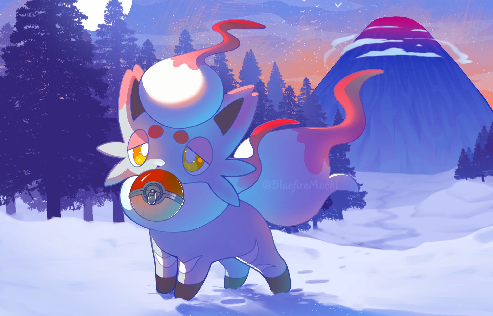 bluefire_mochi bright_pupils grey_fur highres hisuian_poke_ball hisuian_zorua holding holding_poke_ball looking_at_viewer mouth_hold nintendo no_humans outdoors poke_ball pokemon pokemon_(creature) red_fur snow solo white_pupils yellow_eyes