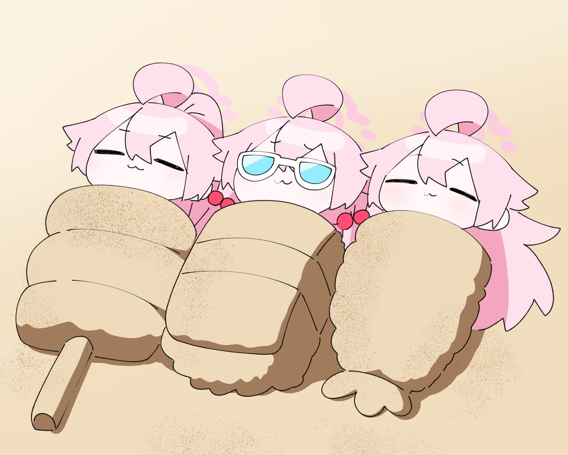 3girls :3 =_= ahoge beach blue-tinted_eyewear blue_archive buried_in_sculpted_sand chibi chibi_only dango food hair_between_eyes hair_bobbles hair_ornament halo high_ponytail highres hoshino_(armed)_(blue_archive) hoshino_(blue_archive) hoshino_(swimsuit)_(blue_archive) kirine_shiro long_hair low_twintails multiple_girls multiple_persona pink_hair pink_halo ponytail sand shrimp shrimp_tempura skewer sunglasses sushi tempura tinted_eyewear twintails very_long_hair wagashi