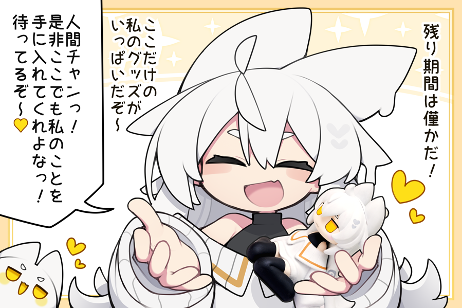 1girl ahoge bare_shoulders black_shirt china_dress chinese_clothes commentary_request deformed dorodra_(kisaragi_kaya) dress facing_viewer fang flipped_hair hands_up heart holding_figure kisaragi_kaya long_sleeves off-shoulder_sweater off_shoulder open_mouth original photo_inset shirt skin_fang sleeveless sleeveless_shirt sleeveless_turtleneck slime_(creature) smile sparkle_background sweater translation_request turtleneck turtleneck_shirt upper_body white_hair white_sweater