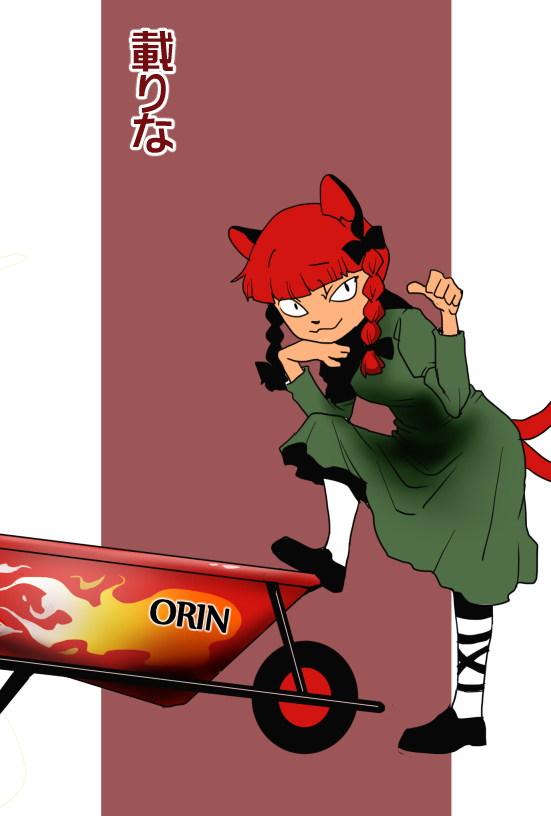 1girl :3 animal_ears black_bow black_eyes black_ribbon black_shoes blunt_bangs bow braid cat_ears cat_girl cat_tail character_name closed_mouth commentary_request dress full_body green_dress hair_bow hand_on_own_chin kaenbyou_rin leg_ribbon looking_at_viewer medium_hair multiple_tails onikobe_rin red_hair ribbon shoes smile socks solo tail touhou translation_request twin_braids two_tails wheelbarrow white_socks
