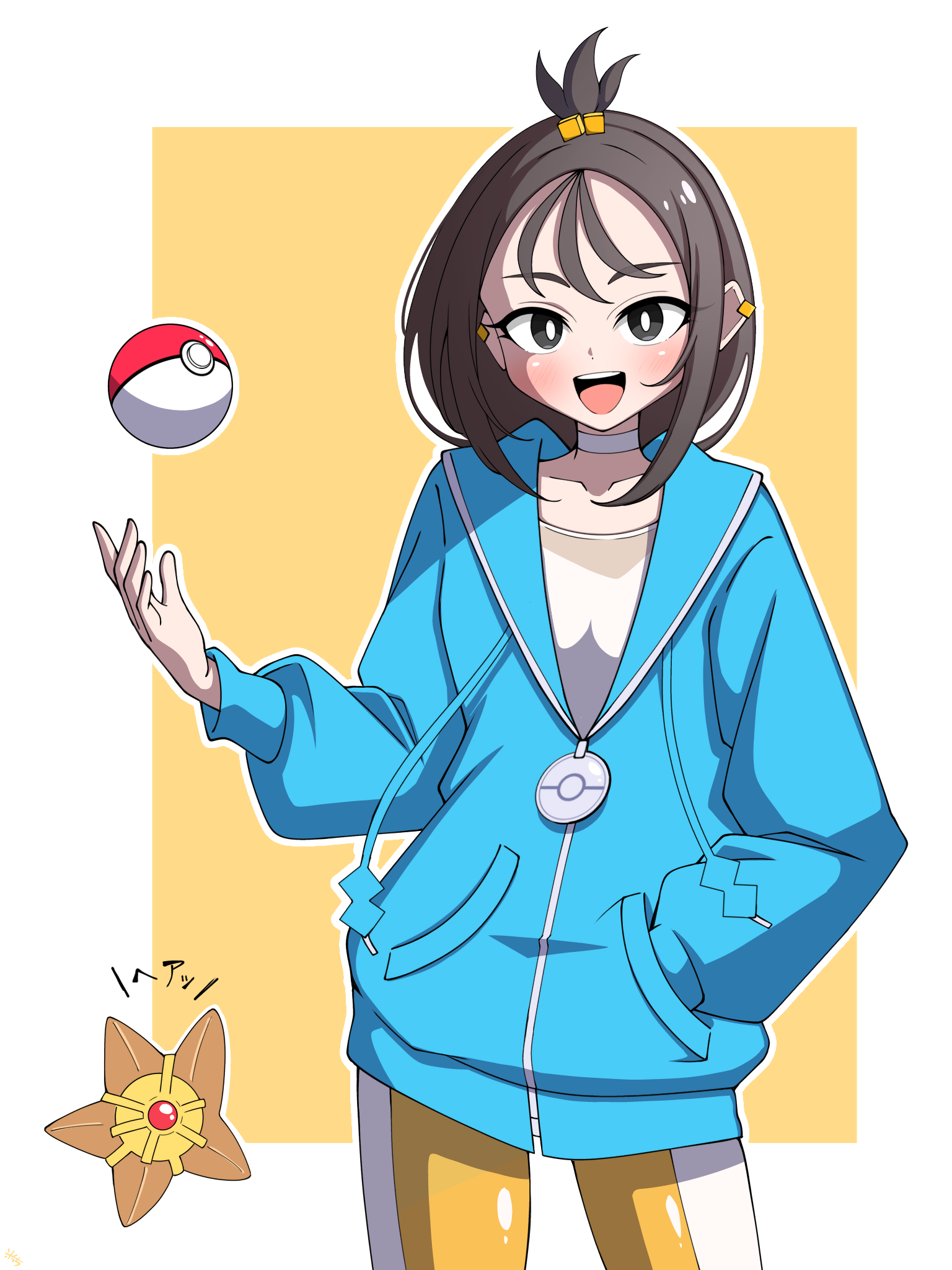 1girl :d black_hair blue_hoodie bright_pupils commentary_request cube_hair_ornament gen_1_pokemon hair_ornament hand_in_pocket happy highres hood hoodie komemimi_0523 leggings lida_(pokemon) long_hair long_sleeves looking_at_viewer nintendo open_mouth outline poke_ball poke_ball_(basic) pokemon pokemon_(creature) pokemon_legends:_z-a smile staryu teeth tongue topknot upper_teeth_only white_pupils yellow_background