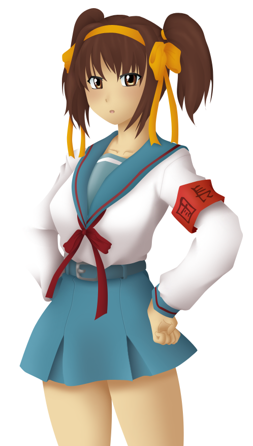1girl alternate_hairstyle armband belt breasts brown_eyes brown_hair drawfag female_focus hands_on_own_hips headband large_breasts open_mouth school_uniform short_twintails simple_background solo suzumiya_haruhi suzumiya_haruhi_no_yuuutsu twintails