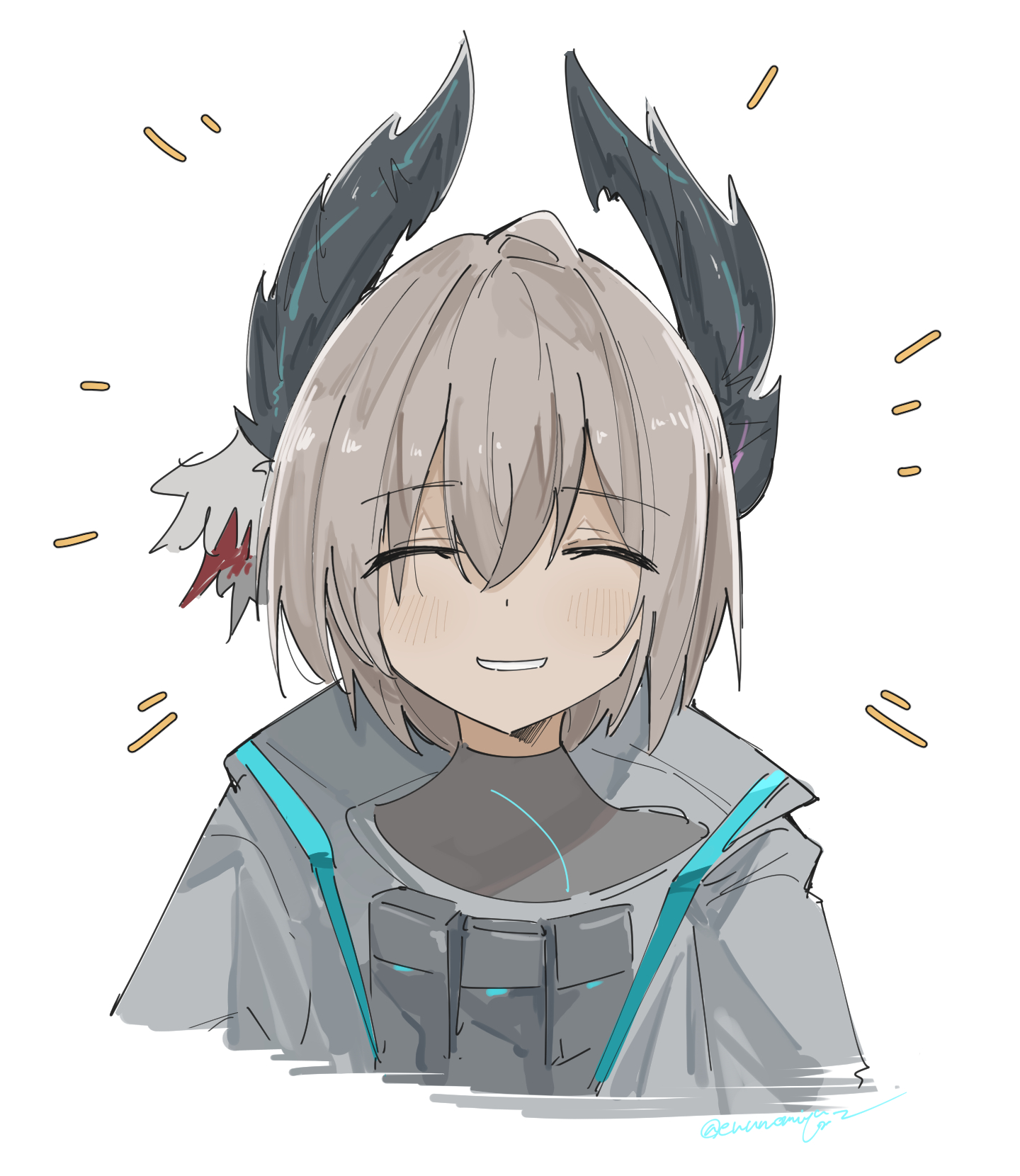 1girl :d ^_^ arknights black_shirt blush closed_eyes commentary_request cropped_shoulders enunomiya facing_viewer grey_hair grey_jacket grin hair_between_eyes happy_aura highres jacket open_mouth partial_commentary pouch raidian_(arknights) shirt short_hair simple_background smile solo white_background