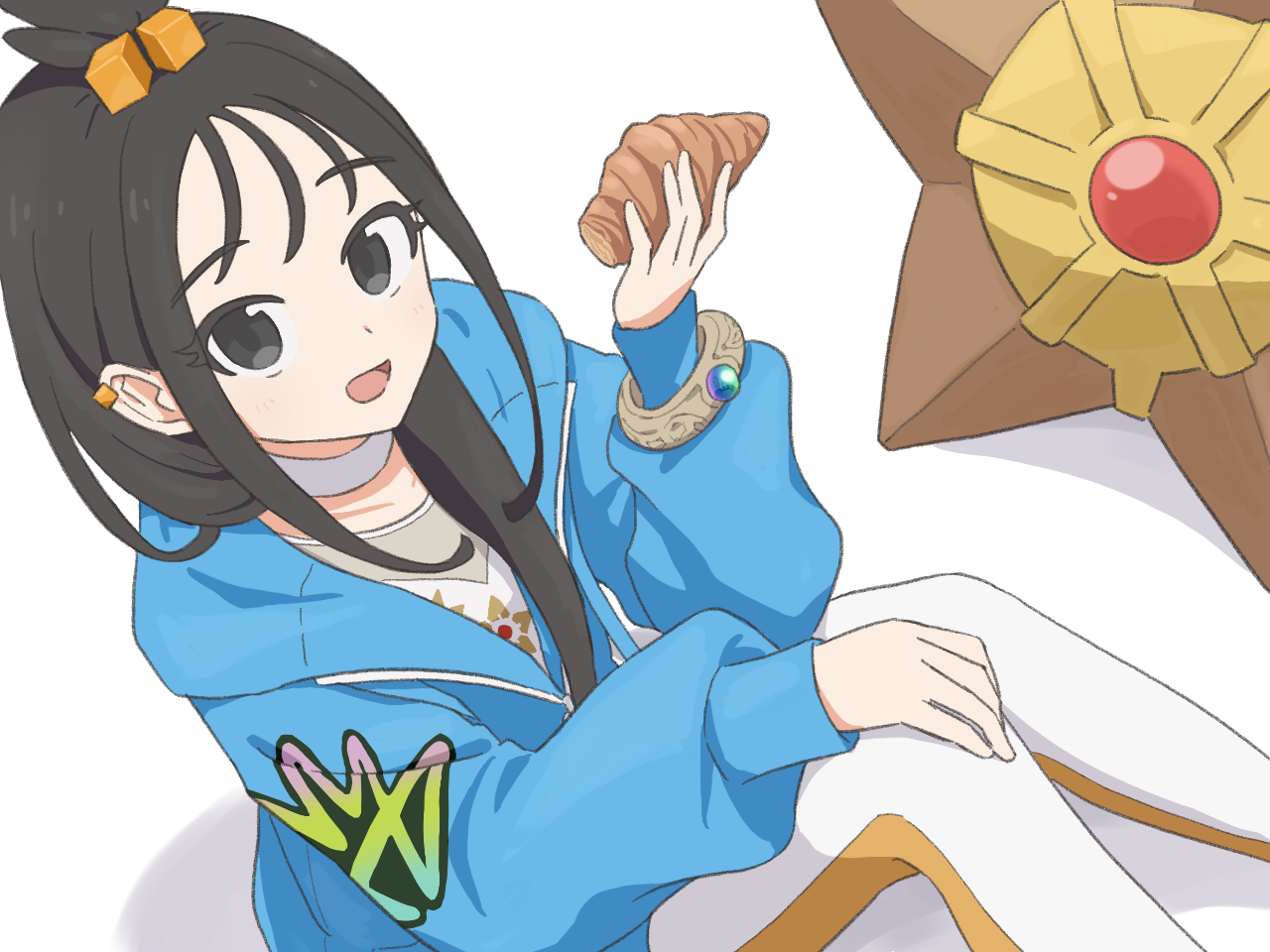 1girl :d black_hair blue_hoodie bracelet commentary_request croissant cube_hair_ornament earclip food fujiyama_(yellow) gen_1_pokemon hair_ornament happy hood hood_down hoodie jewelry lida_(pokemon) long_hair long_sleeves nintendo open_mouth pants pokemon pokemon_(creature) pokemon_legends:_z-a shirt sitting smile staryu tongue topknot white_pants white_shirt