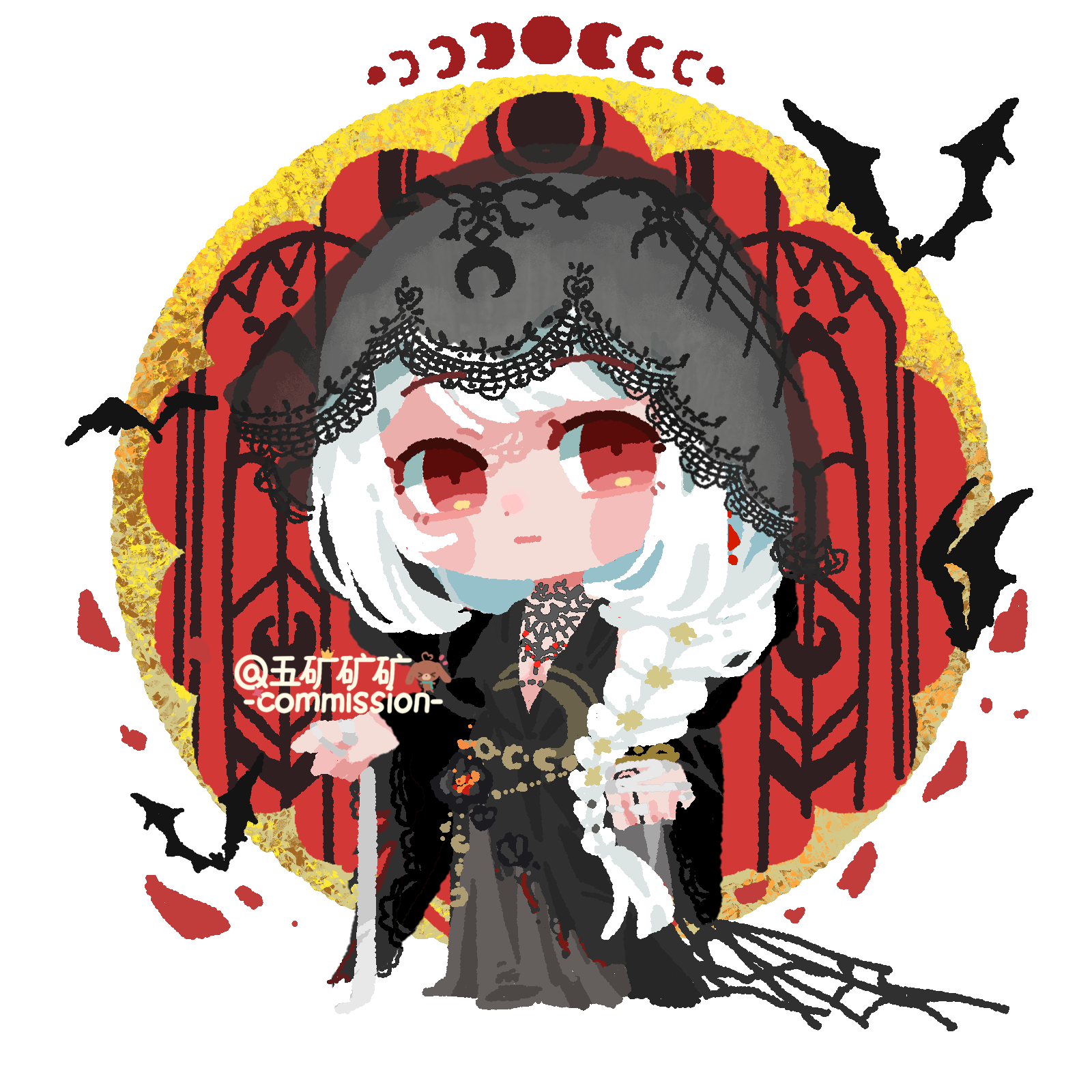 1girl bat_(animal) black_dress black_veil chibi circle closed_mouth commission dress full_body highres lace-trimmed_veil lace_trim long_braid long_dress looking_at_viewer moon_phases official_alternate_costume red_background red_eyes reverse:1999 semmelweis_(reverse:1999) semmelweis_(the_wax_and_wane_of_the_heart)_(reverse:1999) solo two-tone_background veil white_background white_hair zaixian_zuomeng