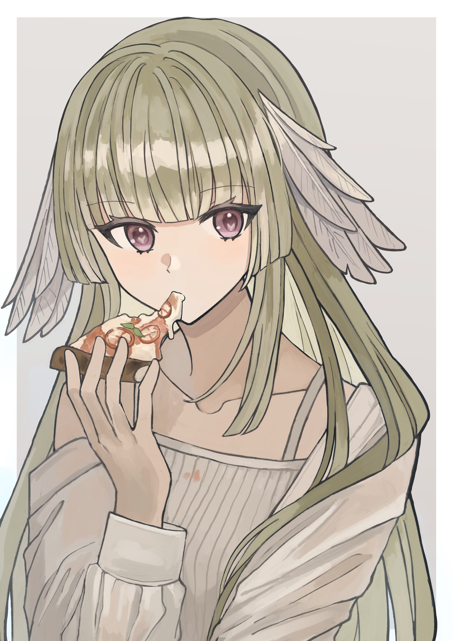 1girl arknights bare_shoulders collarbone commentary food green_hair grey_background highres holding holding_food long_hair long_sleeves looking_at_viewer pizza pizza_slice poncirus_(arknights) purple_eyes simple_background solo untranslatable_commentary udo_(akn_otk) upper_body