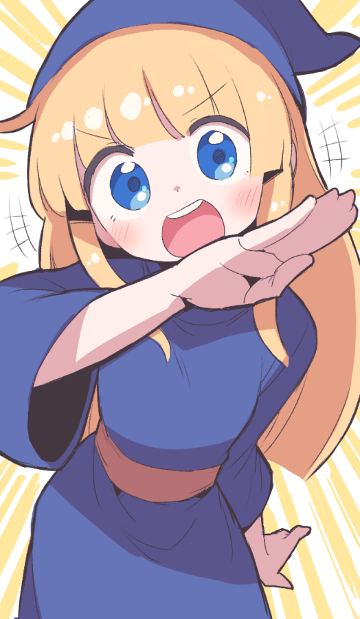 1girl blonde_hair blue_dress blue_eyes blue_hat blush dokan_(dkn) dress hat looking_at_viewer open_mouth puyopuyo round_teeth sash sidelocks solo tareme teeth upper_teeth_only v-shaped_eyebrows witch_(puyopuyo)