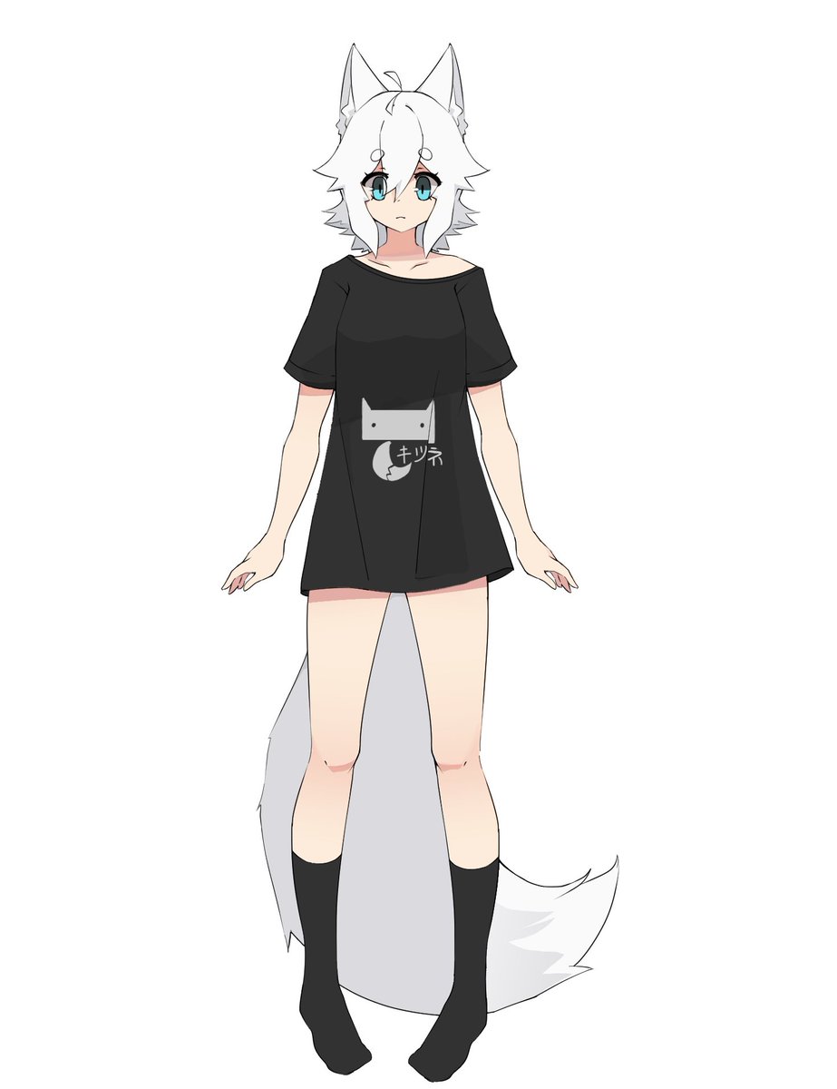 ahoge animal_ear_fluff animal_ears blue_eyes collarbone crikochan fox_ears fox_tail hair_between_eyes highres niane_snowvac off_shoulder shirt socks tail thighs white_hair
