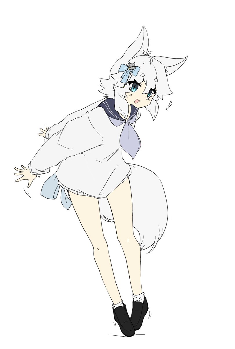 ! :d animal_ears blue_eyes crikochan fox_ears fox_tail hair_between_eyes hair_ornament hair_ribbon happy highres looking_at_viewer niane_snowvac open_mouth ribbon simple_background smile tail thighs tiptoes white_background white_hair