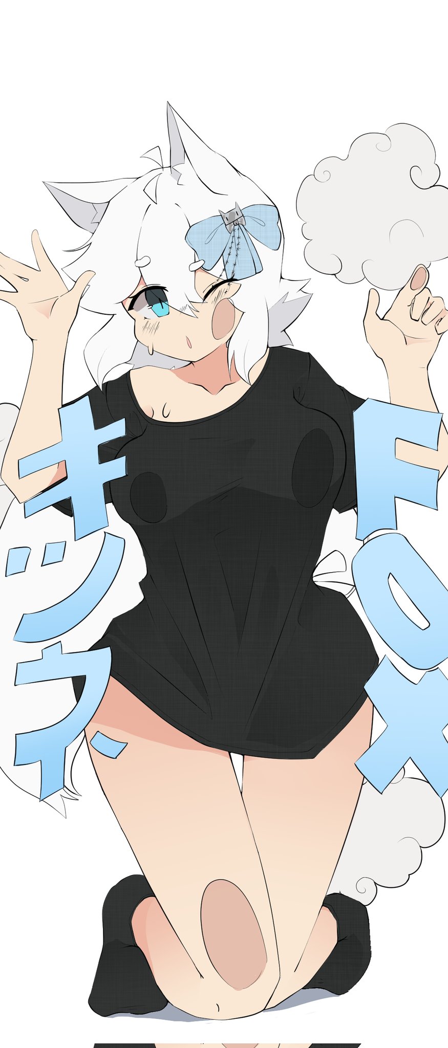 ahoge animal_ear_fluff animal_ears blue_eyes breast_press collarbone crikochan fox_ears fox_tail hair_between_eyes hair_ribbon hands_up highres knees_together_feet_apart niane_snowvac one_eye_closed open_mouth ribbon sitting socks sweatdrop tail thigh_gap thighs white_hair wide_hips