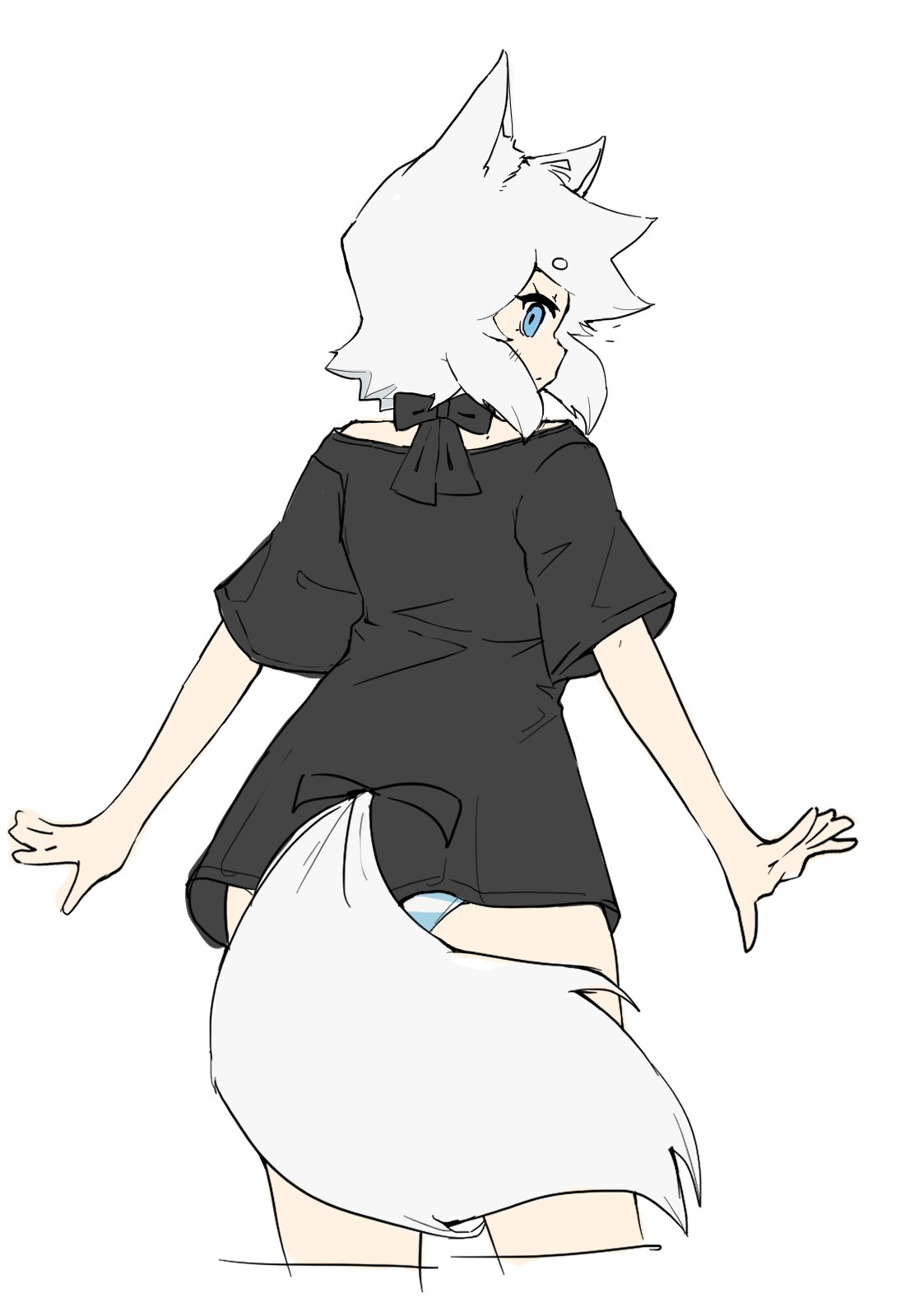 ahoge animal_ear_fluff animal_ears arms_at_sides blue_eyes crikochan fox_ears fox_tail from_behind highres looking_at_viewer looking_back niane_snowvac off_shoulder panties ribbon simple_background striped_clothes striped_panties tail thighs underwear white_background white_hair