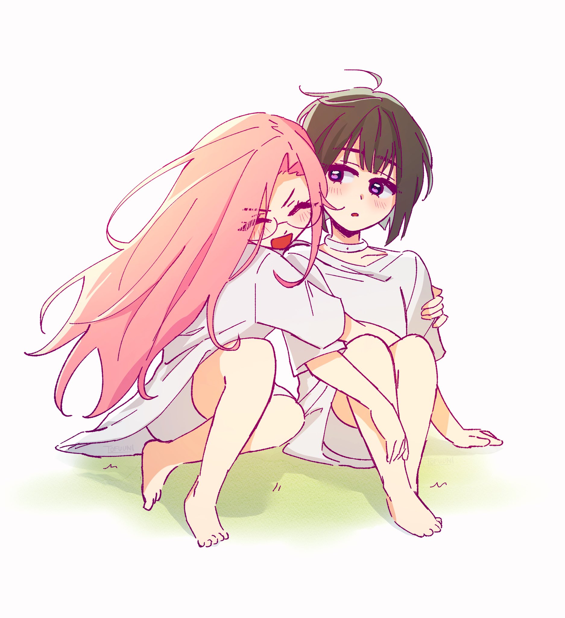 2girls alien_stage barefoot black_hair choker closed_eyes commentary dress english_commentary glasses highres hug knees_up long_hair mizi_(alien_stage) multiple_girls pink_hair purple_eyes short_hair short_sleeves sitting sua_(alien_stage) toastyy very_long_hair white_choker white_dress