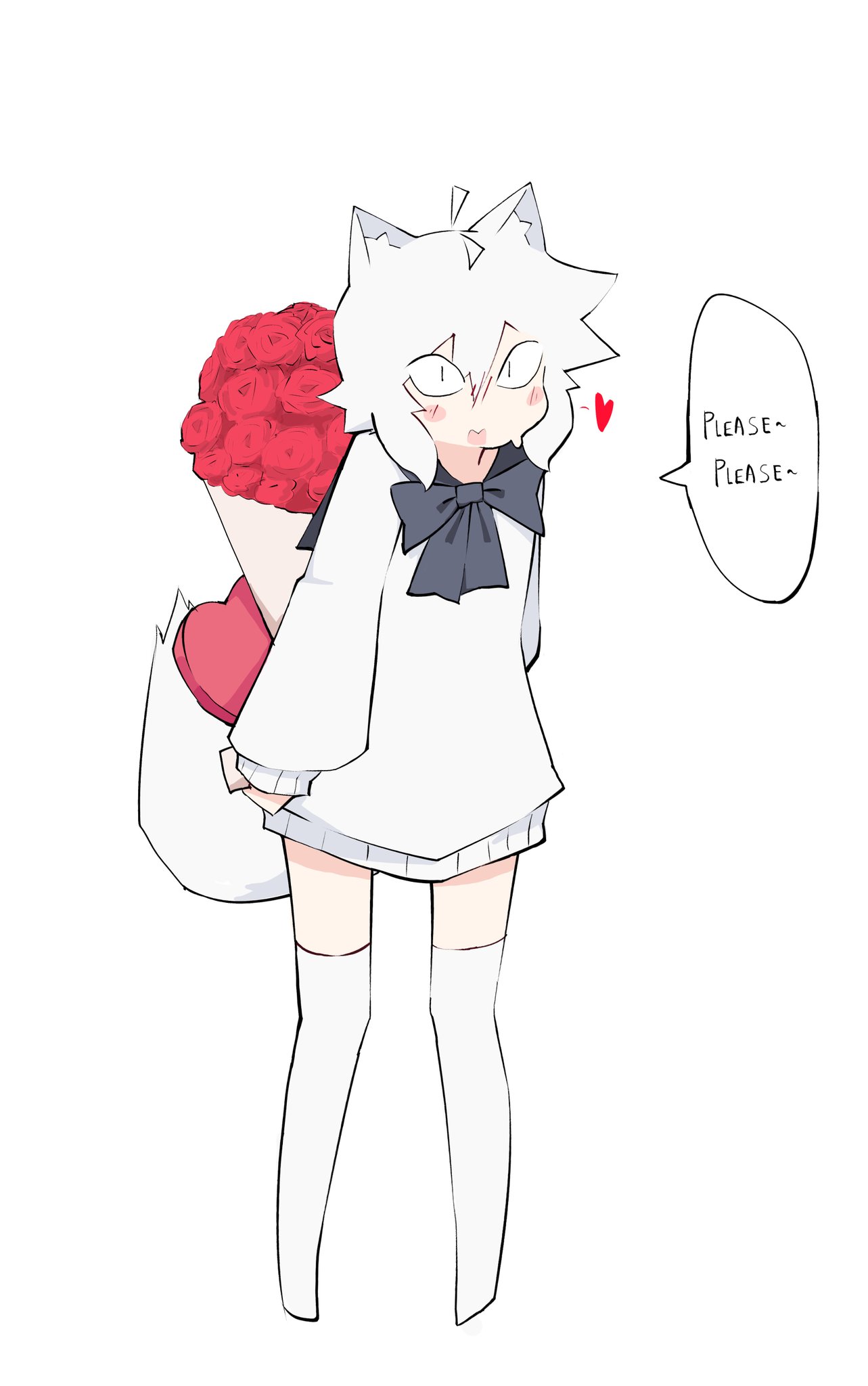 ahoge animal_ear_fluff blush bouquet bow bowtie box box_of_chocolates crikochan embarrassed flower heart highres niane_snowvac open_mouth simple_background slit_pupils speech_bubble thigh_gap thighhighs white_background white_hair