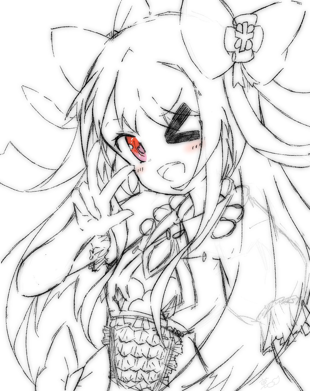 1girl chaos_marie_(grimms_notes) grimms_notes highres kusa_re_manjuu looking_at_viewer one_eye_closed open_mouth partially_colored pink_eyes smile solo
