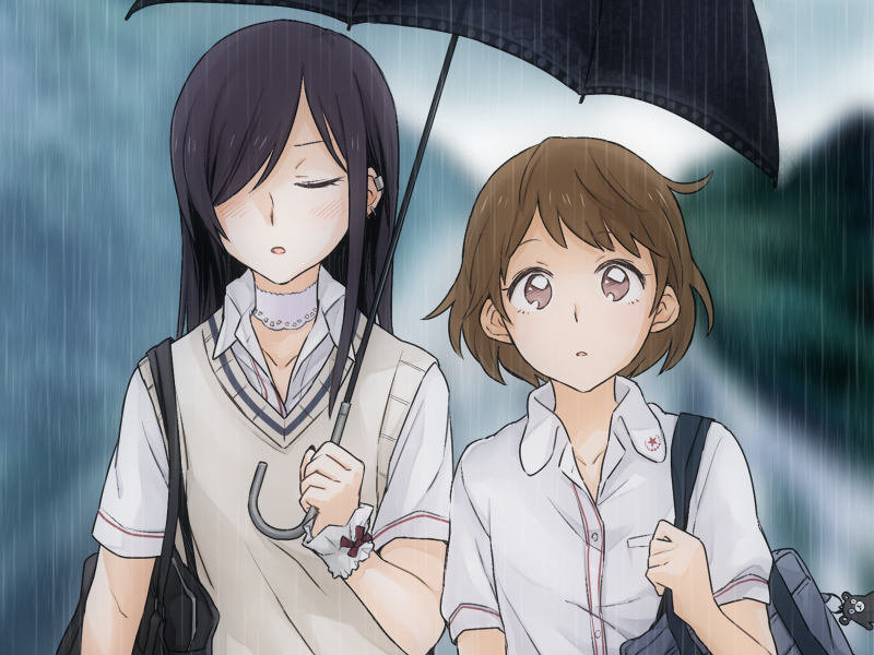 2girls bag black_umbrella blush brown_eyes brown_hair choker closed_mouth collared_shirt day earclip futano_sasa game_cg grey_sweater_vest hair_over_one_eye holding holding_umbrella ichiki_umi long_hair multiple_girls non-web_source okujou_no_yurirei-san outdoors parted_lips pe88y_(yu_tsugirls) purple_hair rain school_bag school_uniform self-datamine shared_umbrella shirt short_sleeves smile sweater_vest umbrella white_choker white_shirt