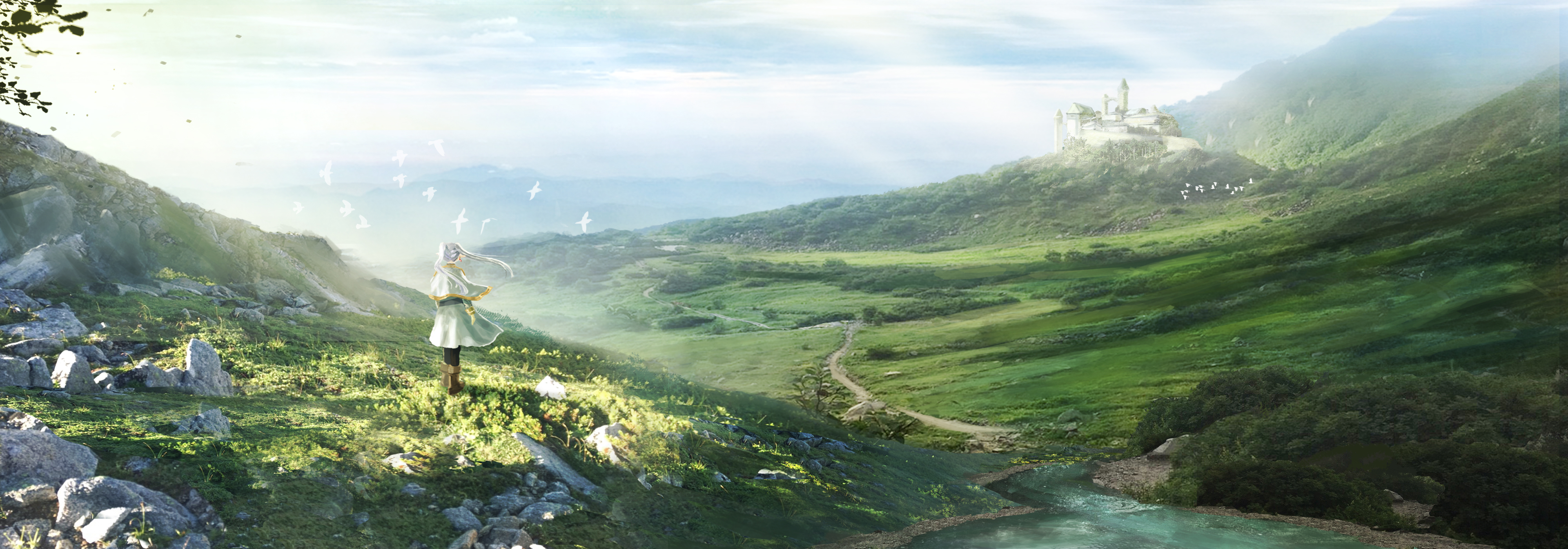 1girl 4_5needecon absurdres arm_at_side black_pantyhose boots brown_boots building bush capelet castle commentary_request day dirt_road earrings flower frieren from_behind highres jewelry leaf light_rays long_hair long_sleeves nature outdoors pantyhose road rock scenery shirt simple_bird skirt solo sousou_no_frieren standing stream sunbeam sunlight teardrop_earrings tree twintails valley very_wide_shot white_capelet white_hair white_shirt white_skirt