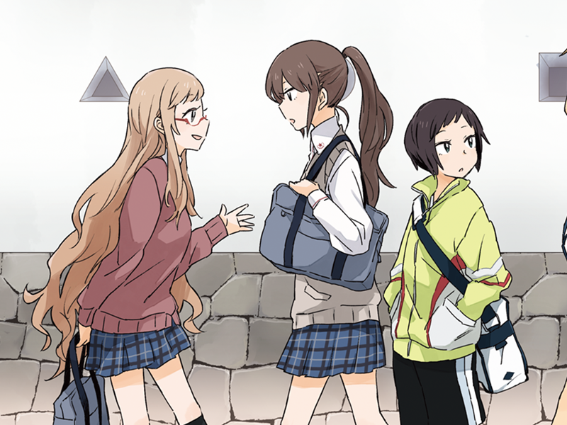 3girls ano_fuji bag black_shorts blue_skirt brown_hair duffel_bag game_cg green_jacket hands_in_pockets jacket komano_hina long_hair looking_at_another multiple_girls non-web_source okujou_no_yurirei-san outdoors parted_lips pe88y_(yu_tsugirls) pink_sweater plaid_clothes plaid_skirt pleated_skirt ponytail red-framed_eyewear school_bag school_uniform self-datamine semi-rimless_eyewear short_hair shorts skirt smile stone_wall sweater toomi_yuna under-rim_eyewear