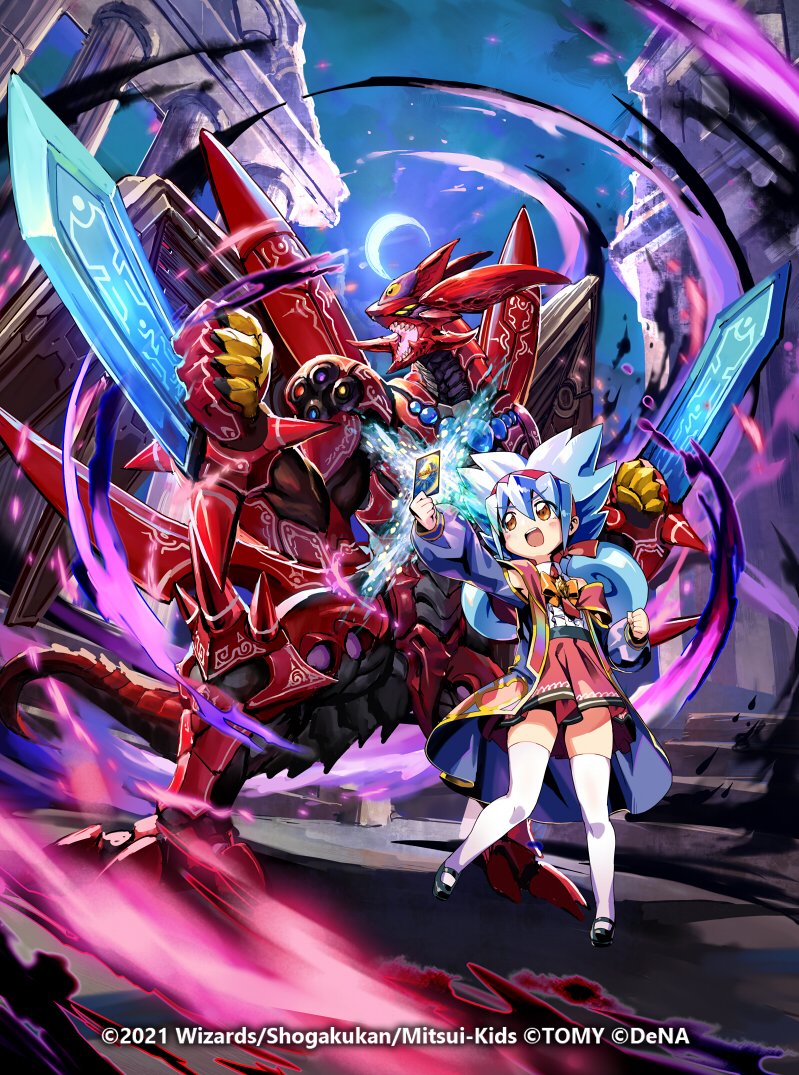 1girl aqua_hair aura black_shoes blush_stickers bow bowtie card copyright_notice crescent_moon dark_aura dragon dragon_tail duel_masters duel_masters_(classic) duel_masters_play's fua_yuu_(duel_masters) hair_ribbon hairband holding holding_card jacket moon multicolored_bow multicolored_bowtie multicolored_jacket necktie night official_art open_mouth outdoors red_bow red_hairband red_necktie red_skirt ribbon ruins shirt shoes skirt tail teeth thighhighs trading_card twintails upper_teeth_only white_shirt white_thighhighs yellow_eyes yuukoo