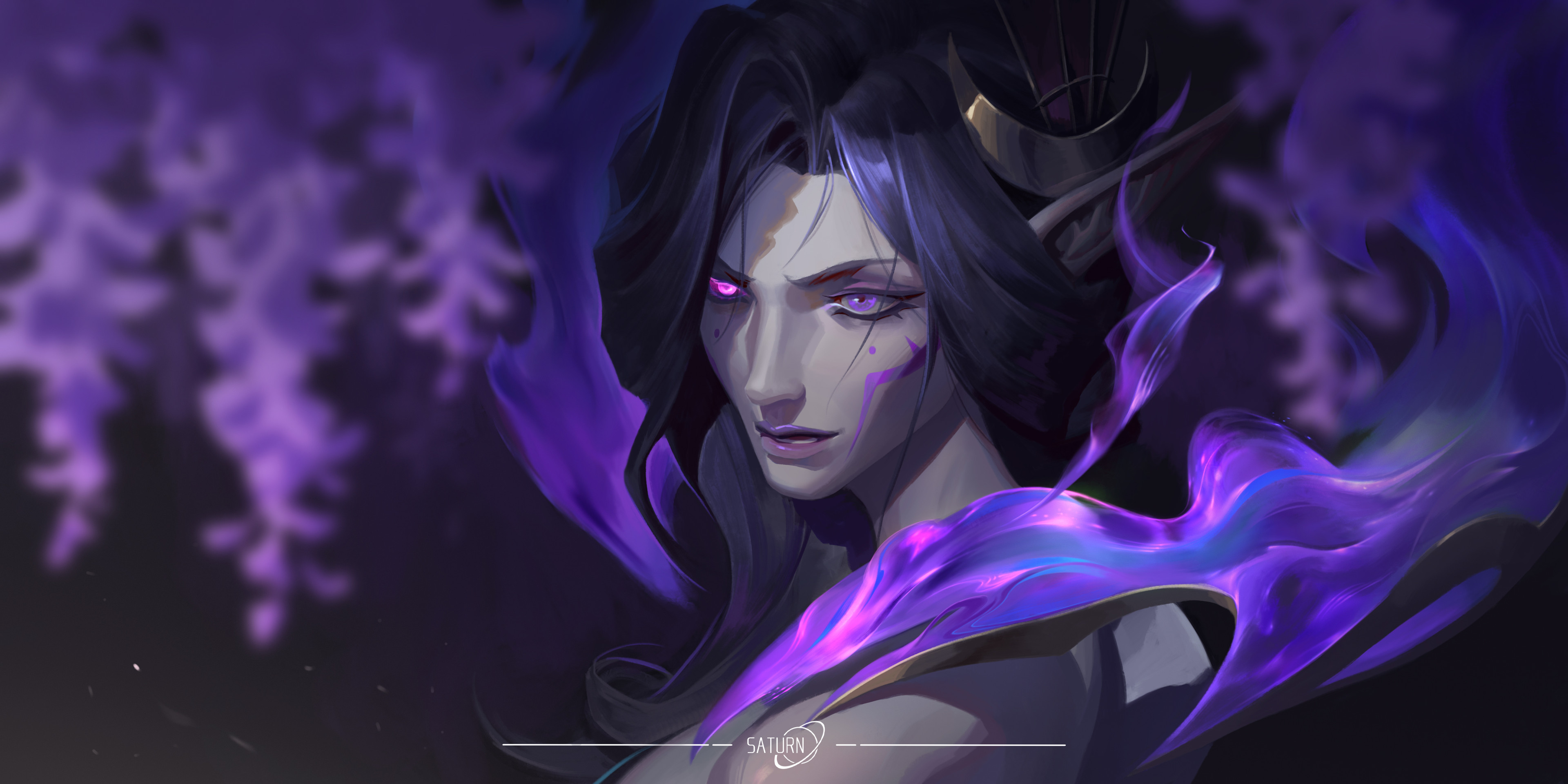 1girl absurdres black_hair facial_mark fire flower heterochromia highres league_of_legends lips long_hair morgana_(league_of_legends) pink_eyes pointy_ears purple_eyes purple_fire purple_flower purple_lips saturn_(satscarlet) solo spirit_blossom_morgana upper_body wisteria