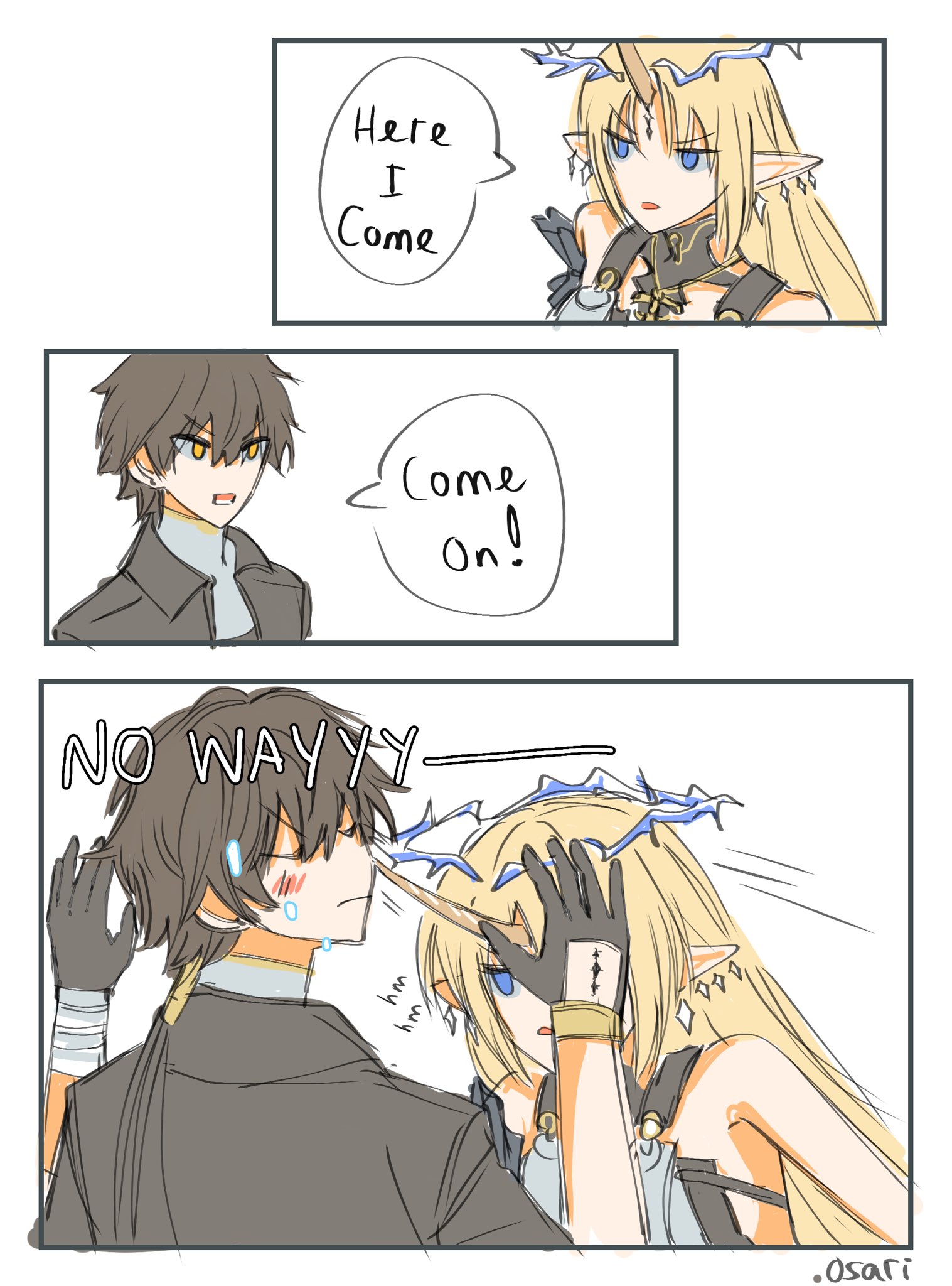 .osari 1boy 1girl black_collar black_gloves black_hair black_jacket blonde_hair closed_mouth collar commentary earrings english_text fleurdelys_(wuthering_waves) floating_earrings gloves highres horns jacket jewelry long_hair long_horns male_rover_(wuthering_waves) necklace pointy_ears poking rover_(wuthering_waves) sidelocks single_horn tacet_mark_(wuthering_waves) untranslatable_commentary wuthering_waves yellow_eyes yellow_horns