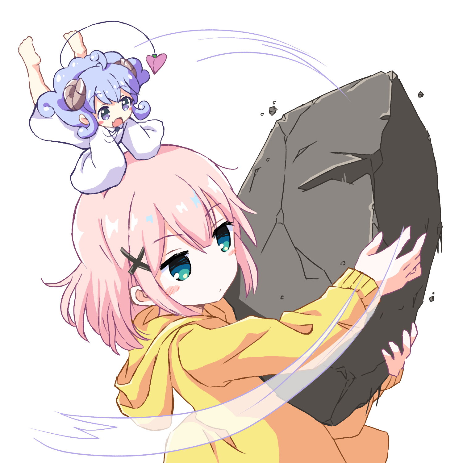 2girls ahoge aqua_eyes blue_hair blush boulder chiyoda_momo commentary_request curled_horns demon_girl demon_horns demon_tail dress hair_ornament highres holding holding_rock hood hood_down hoodie horns lilith_(homunculus)_(machikado_mazoku) lilith_(machikado_mazoku) long_hair long_sleeves machikado_mazoku multiple_girls n88_colpla pink_hair rock short_hair sidelocks simple_background sleeves_past_fingers sleeves_past_wrists tail white_background white_dress x_hair_ornament yellow_hoodie