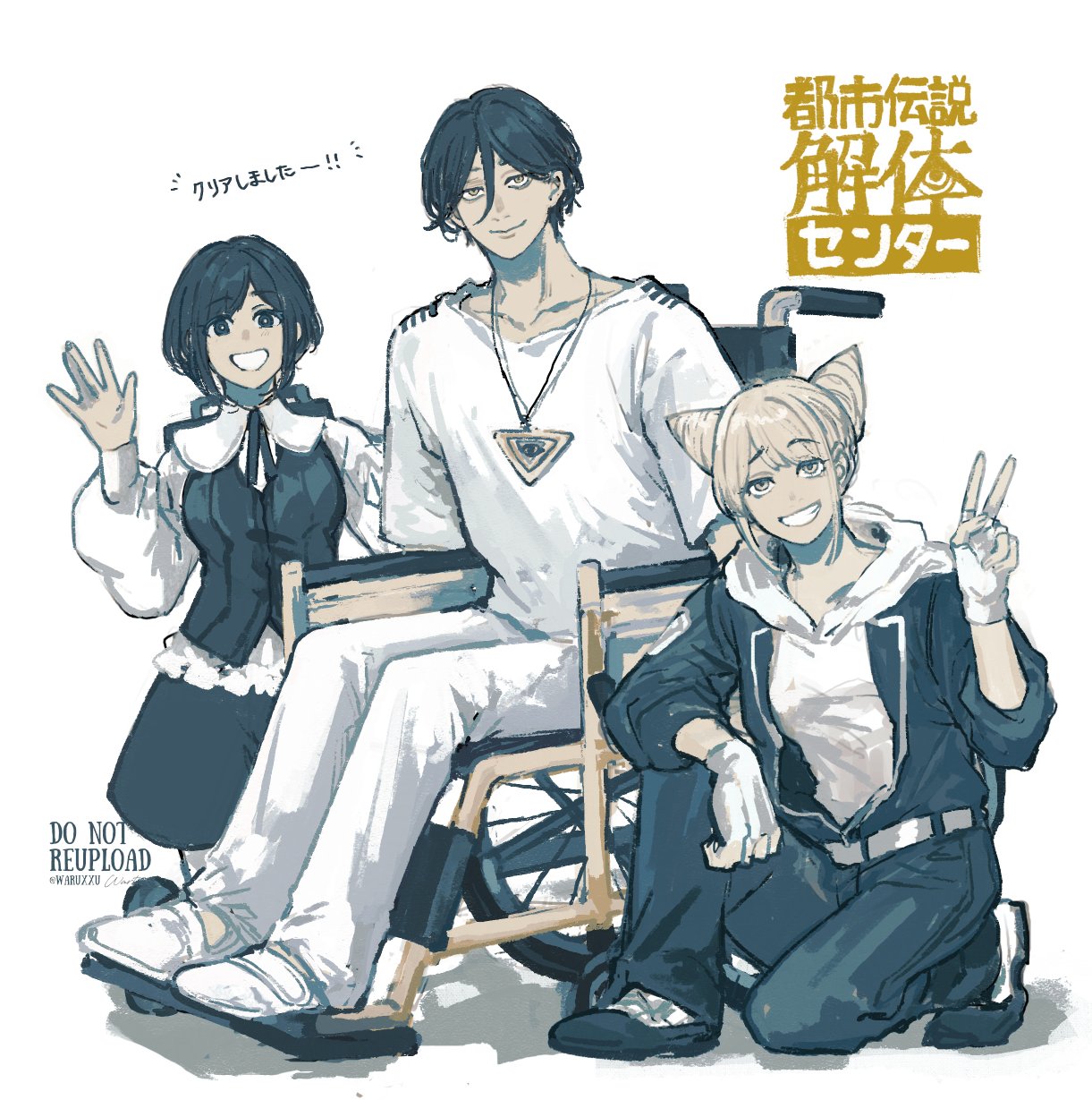 1boy 2girls blue_eyes blue_hair closed_mouth collared_shirt commentary_request cone_hair_bun copyright_name double_bun frilled_shirt frilled_sleeves frills fukurai_azami full_body gloves hair_bun hand_up highres jasmine_(toshi_densetsu_kaitai_center) jumpsuit limited_palette long_sleeves looking_at_viewer meguriya_ayumu multiple_girls on_one_knee open_hand open_mouth pants shirt shoes short_hair simple_background sitting skirt smile toshi_densetsu_kaitai_center translation_request triangle_necklace v waltz_(tram) wheelchair white_background white_gloves