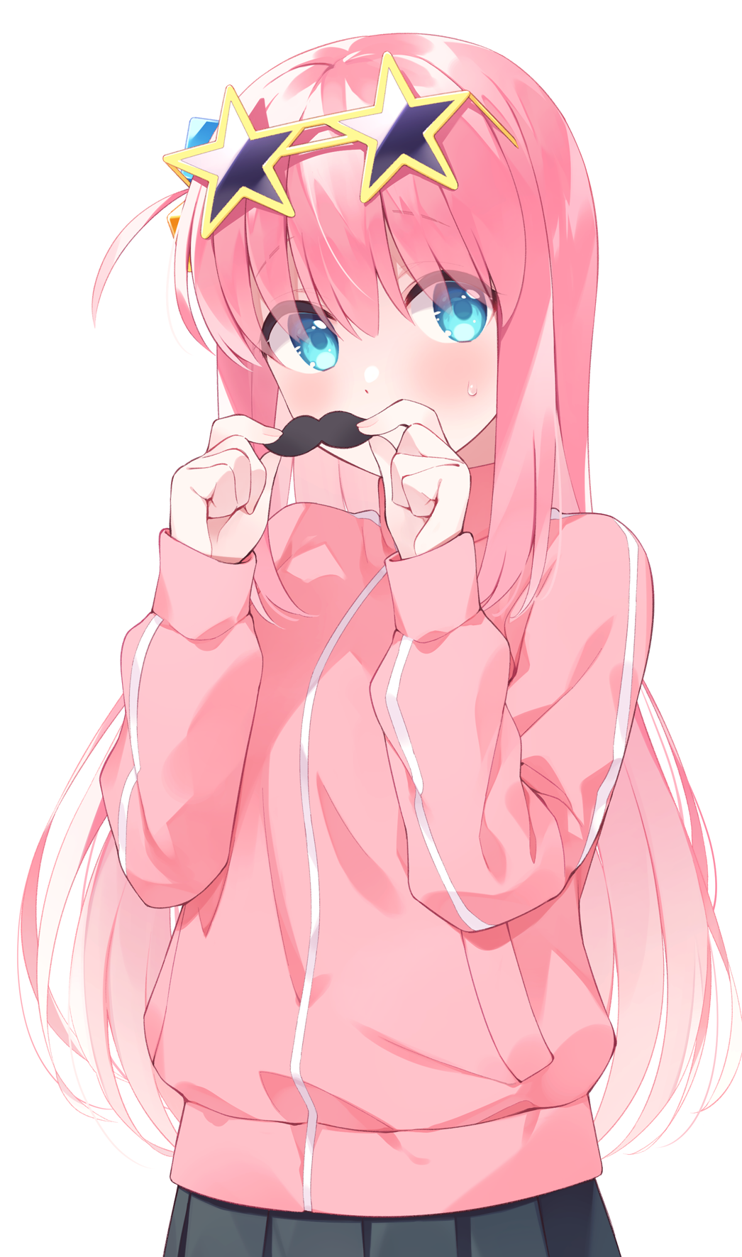 1girl black_skirt blue_eyes blush bocchi_the_rock! commentary cube_hair_ornament eyewear_on_head fake_facial_hair fake_mustache gotoh_hitori hair_ornament highres holding jacket kano_hito long_hair long_sleeves looking_at_viewer one_side_up pink_hair pink_jacket pleated_skirt sidelocks simple_background skirt solo star-shaped_eyewear star_(symbol) sunglasses track_jacket upper_body white_background