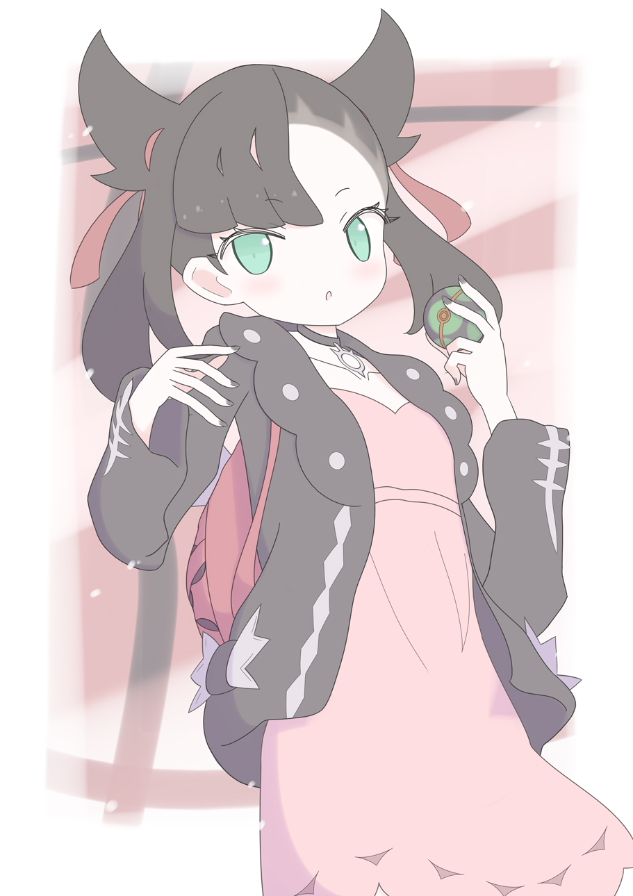 1girl asymmetrical_bangs backpack bag black_choker black_hair black_jacket black_nails choker dress dusk_ball green_eyes hair_ribbon highres holding holding_poke_ball jacket looking_at_viewer marnie_(pokemon) nintendo parted_lips pink_dress poke_ball pokemon pokemon_sword_and_shield red_ribbon ribbon shisa-tsukishima solo twintails undercut