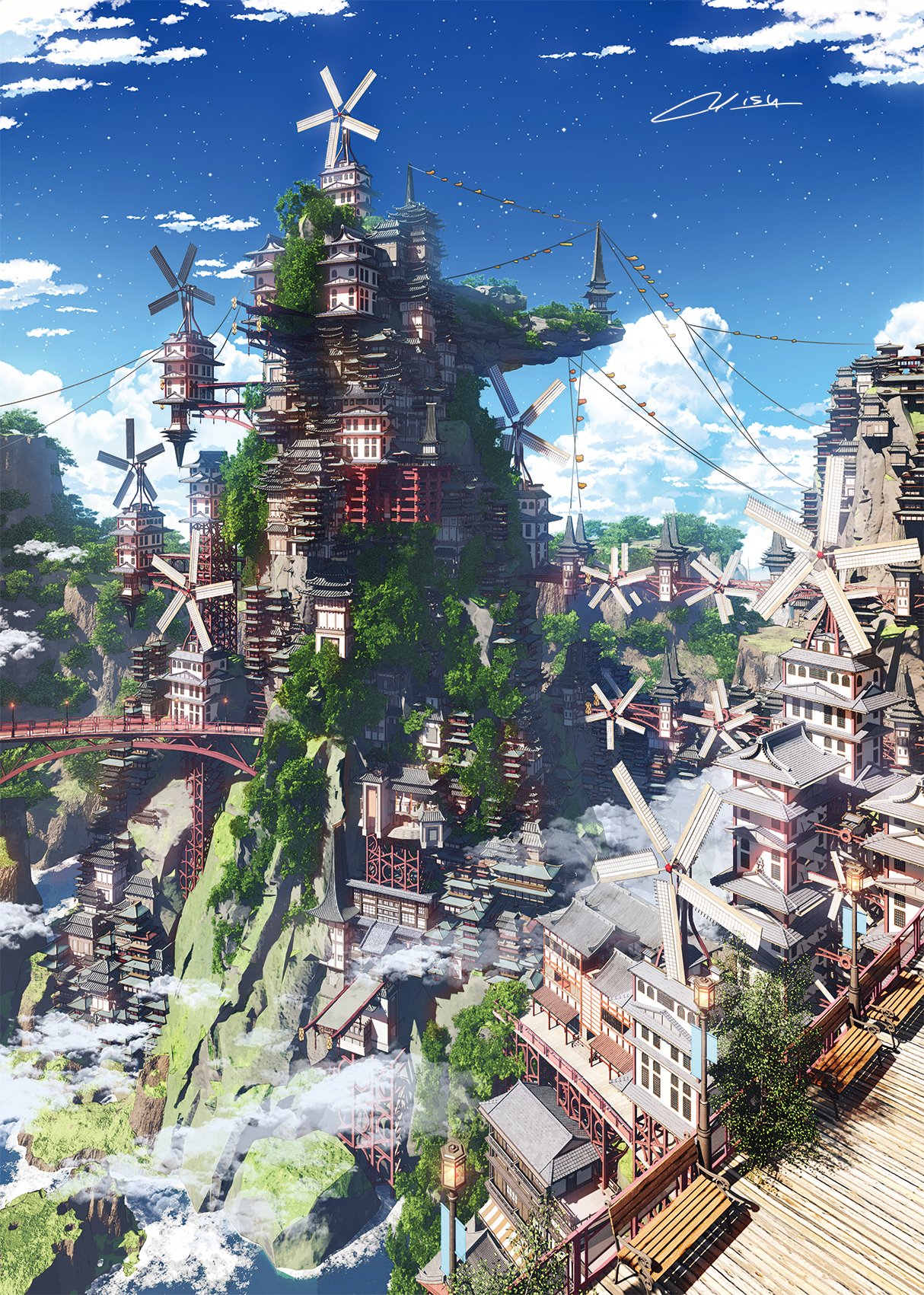 architecture bench blue_sky bridge building cloud cumulonimbus_cloud day east_asian_architecture highres lamppost mountain no_humans original outdoors river scenery signature sky tree waisshu_(sougyokyuu) windmill