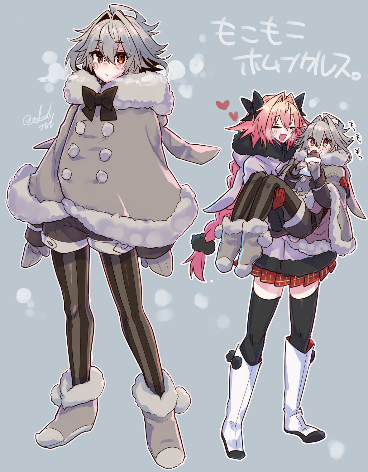 2boys alternate_costume astolfo_(fate) black_bow black_pantyhose black_thighhighs boots bow braid breath carrying carrying_person closed_eyes coat fang fate/apocrypha fate_(series) full_body fur-trimmed_boots fur-trimmed_coat fur_trim grey_hair hair_between_eyes hair_bow hair_intakes haoro highres long_braid male_focus mittens multiple_boys pantyhose pink_hair pleated_skirt pom_pom_(clothes) princess_carry red_eyes short_hair sieg_(fate) single_braid skin_fang skirt smile standing thighhighs trap white_boots winter_clothes zettai_ryouiki