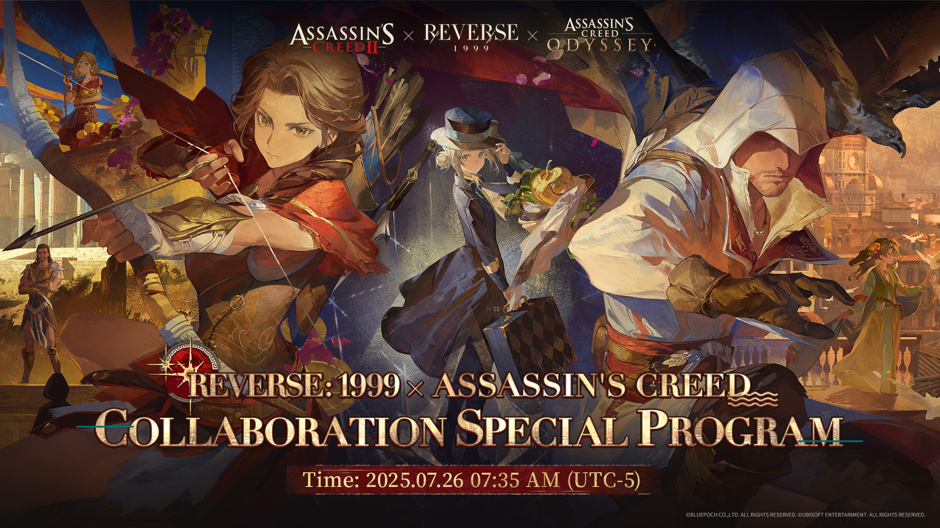 2boys 4girls adjusting_clothes adjusting_headwear alexios_(assassin's_creed) apple apple_(reverse:1999) apple_(the_fruit_of_wisdom)_(reverse:1999) archery architecture armor armored_boots arrow_(projectile) assassin's_creed:_odyssey assassin's_creed_(series) assassin's_creed_ii beard bird black_coat black_hat black_pants blonde_hair blue_bow boater_hat boots bow bow_(weapon) braid breastplate brown_eyes brown_gloves brown_hair coat copyright_name copyright_notice covered_eyes drawing_bow dress eagle english_text european_architecture ezio_auditore_da_firenze facial_hair food fruit gloves golden_apple greco-roman_architecture green_dress grey_eyes grey_hair hair_bun hand_on_headwear hat hat_bow highres holding holding_arrow holding_bow_(weapon) holding_suitcase holding_weapon hood kassandra_(assassin's_creed) kassandra_of_sparta logo long_dress looking_at_viewer monocle multiple_boys multiple_girls official_art pants promotional_art quiver red_tunic regulus_(reverse:1999) reverse:1999 single_side_bun sotheby suitcase tunic v-shaped_eyebrows vertin_(reverse:1999) weapon white_coat