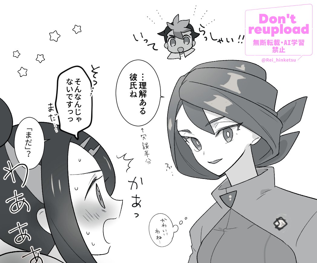 1boy 2girls blush bright_pupils chibi commentary_request eye_contact liko_(pokemon) looking_at_another multiple_girls nintendo onia_(pokemon) open_mouth pokemon pokemon_(anime) pokemon_horizons rei_hinketsu roy_(pokemon) shirt short_hair sidelocks smile speech_bubble star_(symbol) sweat thought_bubble translation_request twitter_username watermark