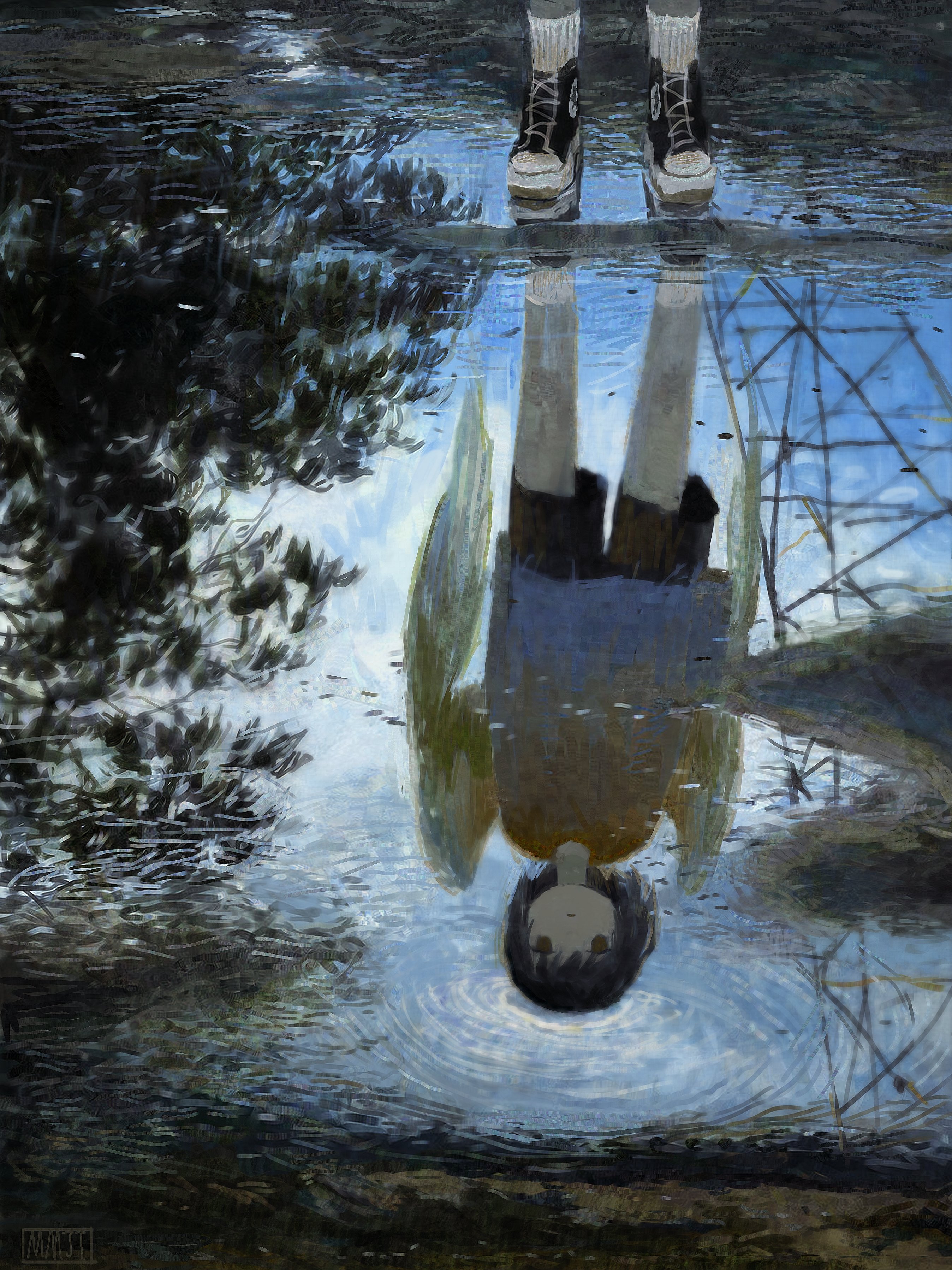 1boy absurdres black_eyes black_hair black_shorts blank_stare blue_shirt dirty feathered_wings from_above full_body highres looking_at_reflection maomi_jita original painterly puddle reflection reflection_focus ripples shirt shoes short_hair shorts sneakers socks solo transmission_tower tree white_socks white_wings wings